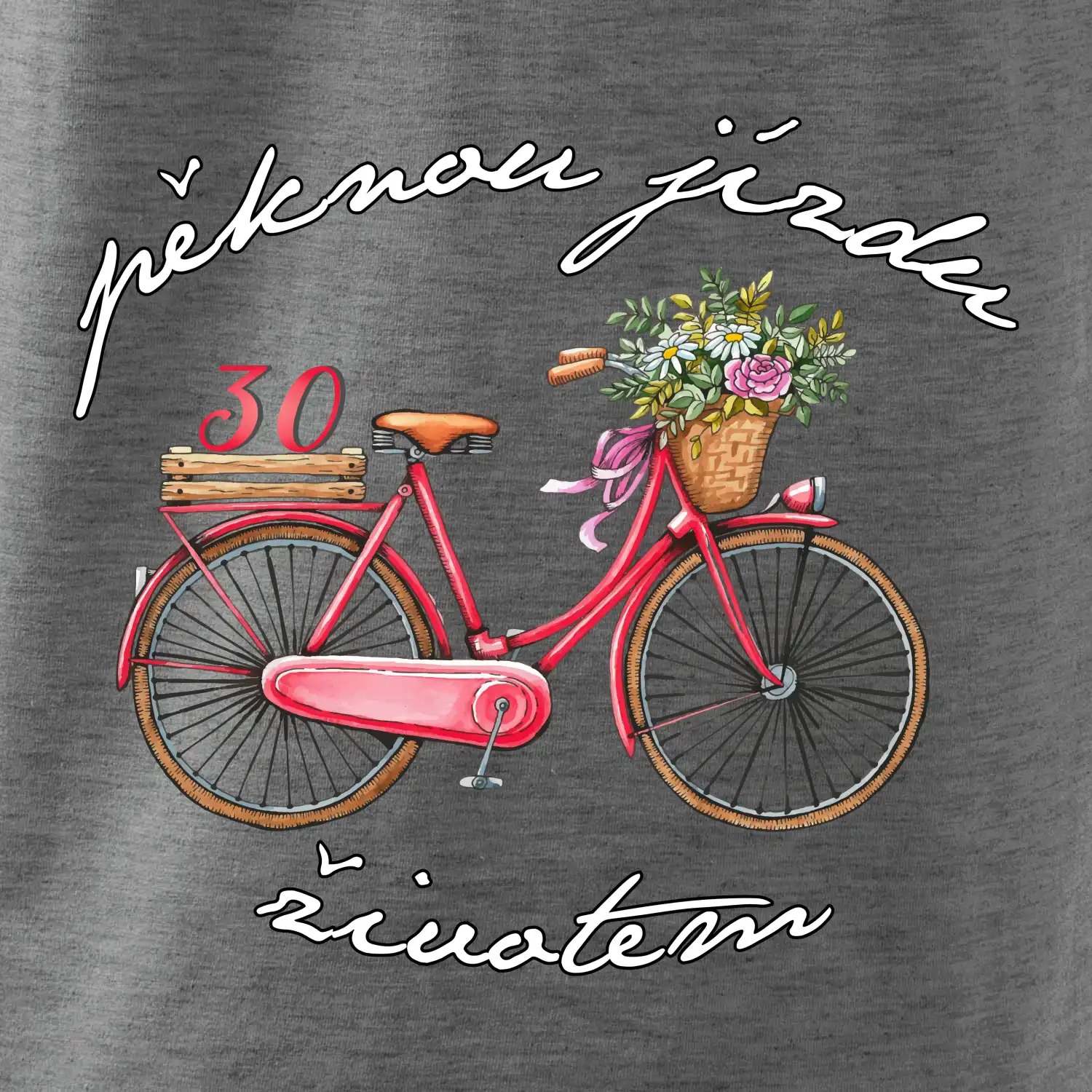 Narozeninové tričko pro ženu, která slaví 30 let, s motem "pěknou jízdu životem". Stylové jízdní kolo na triku jako dárek na 30 narozeniny pro ženu. Dárek pro kamarádku, která slaví jubileum 30 let.