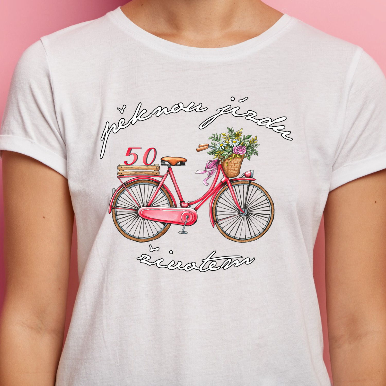 Tričko s motivem Pěknou jízdu životem je určené pro všechny, kteří milují cyklistiku a slaví padesátku stylově. Na obrázku dominuje kreslený bicykl v pohybu, zatímco číslo 50 se objevuje jako drobný, vtipný detail na nosiči kola. Design tak připomíná radost ze života a osobní cestu, která má stále šťávu i v každé nové dekádě.