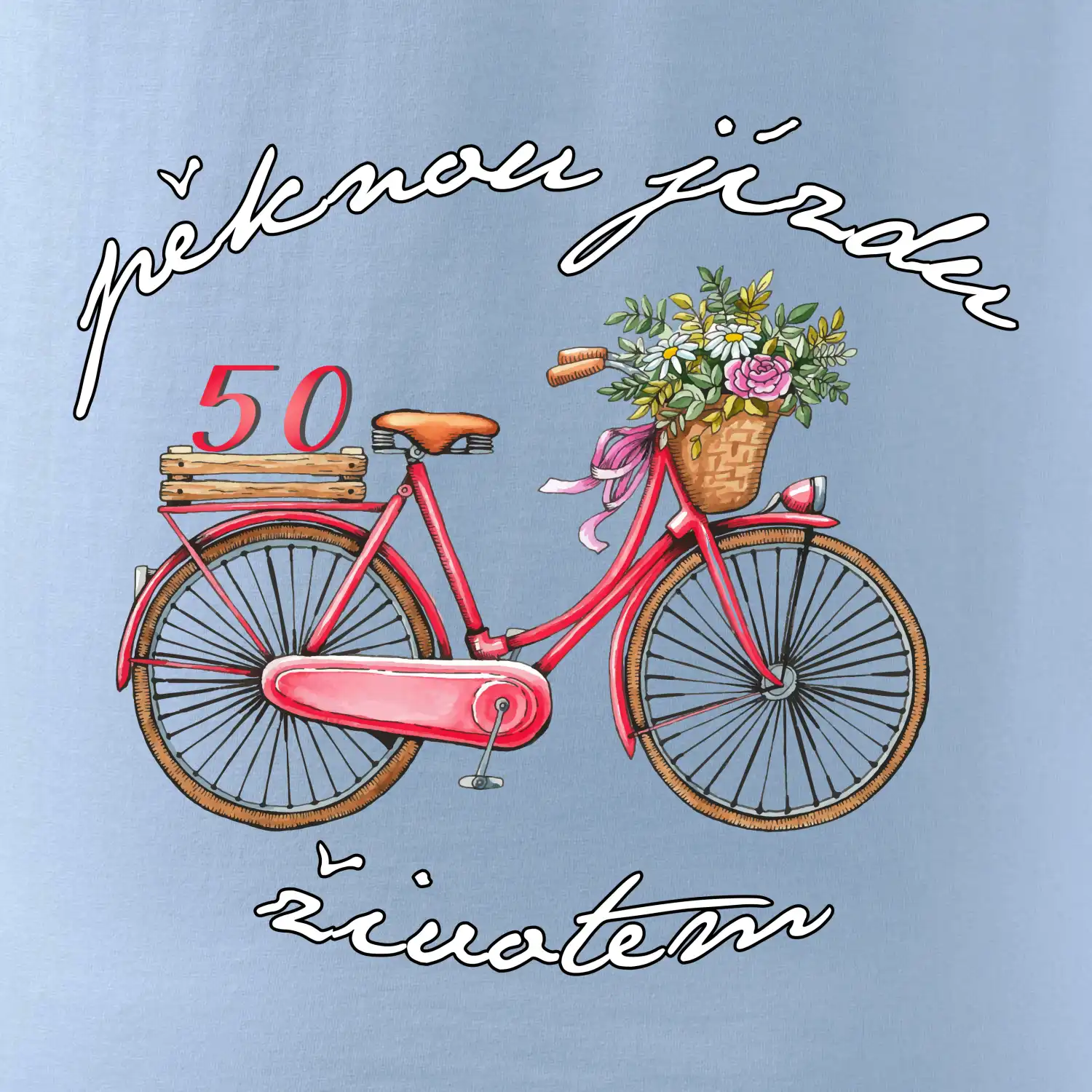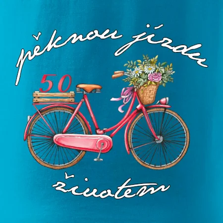 Tričko s motivem Pěknou jízdu životem je určené pro všechny, kteří milují cyklistiku a slaví padesátku stylově. Na obrázku dominuje kreslený bicykl v pohybu, zatímco číslo 50 se objevuje jako drobný, vtipný detail na nosiči kola. Design tak připomíná radost ze života a osobní cestu, která má stále šťávu i v každé nové dekádě.
