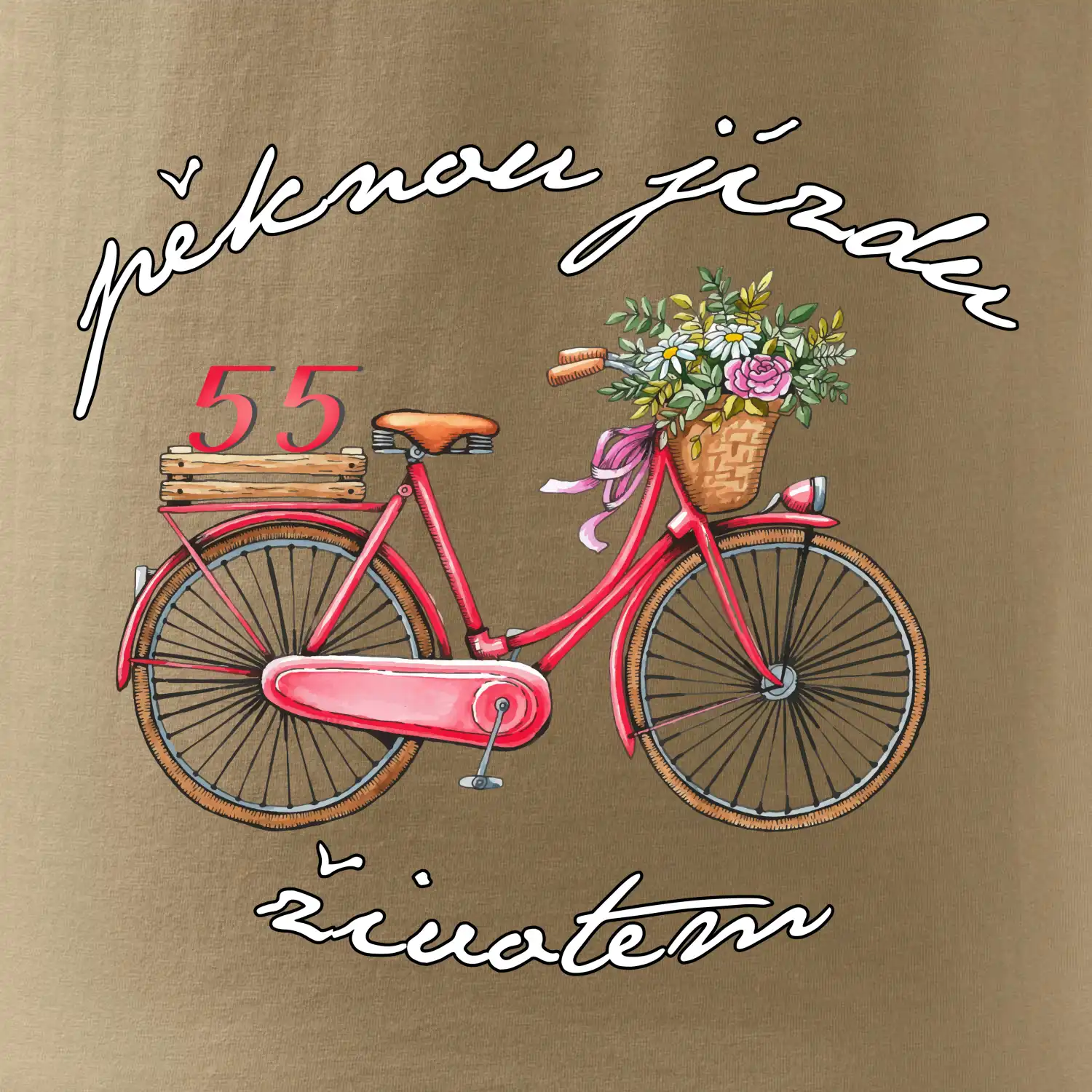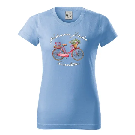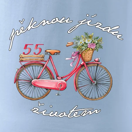 Narozeninové tričko pro babičku nebo tričko pro maminku, která slaví 55 let, s motem "pěknou jízdu životem". Stylové jízdní kolo na triku jako dárek na 55 narozeniny pro ženu. Triko pro babičku nebo triko pro maminku, která slaví jubileum 55 let.