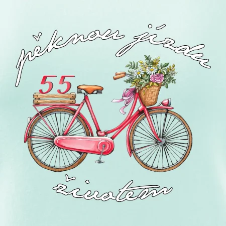 Narozeninové tričko pro babičku nebo tričko pro maminku, která slaví 55 let, s motem "pěknou jízdu životem". Stylové jízdní kolo na triku jako dárek na 55 narozeniny pro ženu. Triko pro babičku nebo triko pro maminku, která slaví jubileum 55 let.