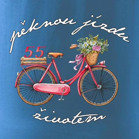 Narozeninové tričko pro babičku nebo tričko pro maminku, která slaví 55 let, s motem "pěknou jízdu životem". Stylové jízdní kolo na triku jako dárek na 55 narozeniny pro ženu. Triko pro babičku nebo triko pro maminku, která slaví jubileum 55 let.