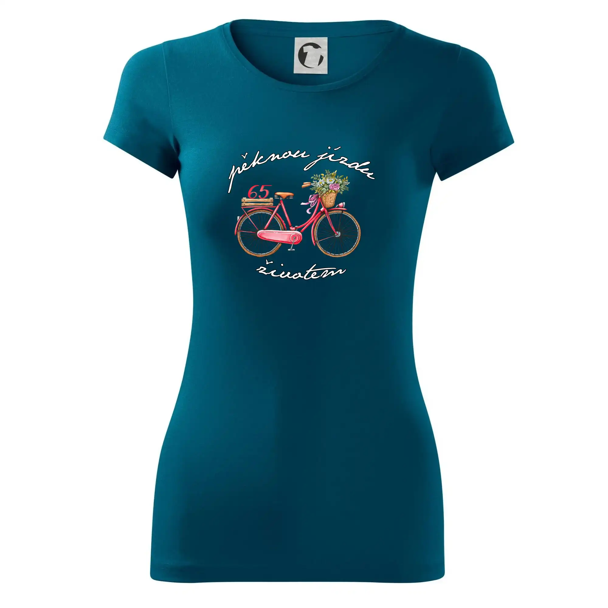 Narozeninové tričko pro babičku, která slaví 65 let, s motem "pěknou jízdu životem". Stylové jízdní kolo na triku jako dárek na 65 narozeniny pro ženu. Triko pro babičku, která slaví jubileum 65 let.