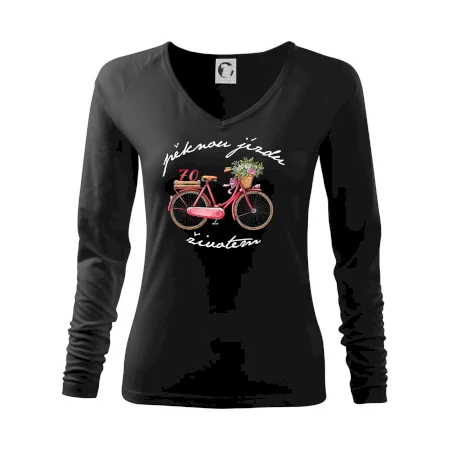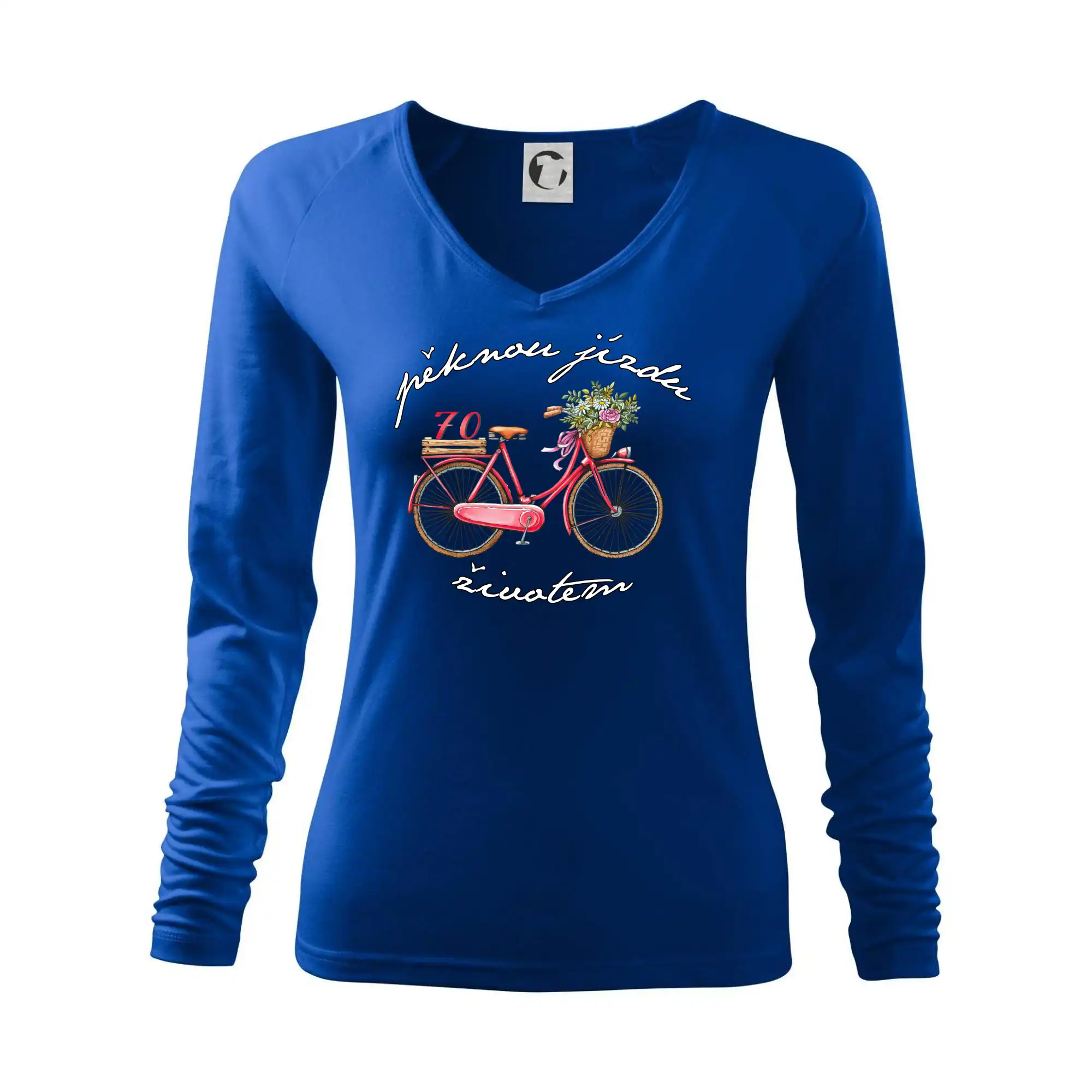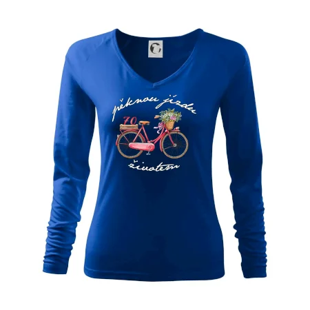 Narozeninové tričko pro babičku, která slaví 70 let, s motem "pěknou jízdu životem". Stylové jízdní kolo na triku jako dárek na 70 narozeniny pro ženu. Triko pro babičku, která slaví jubileum 70 let.