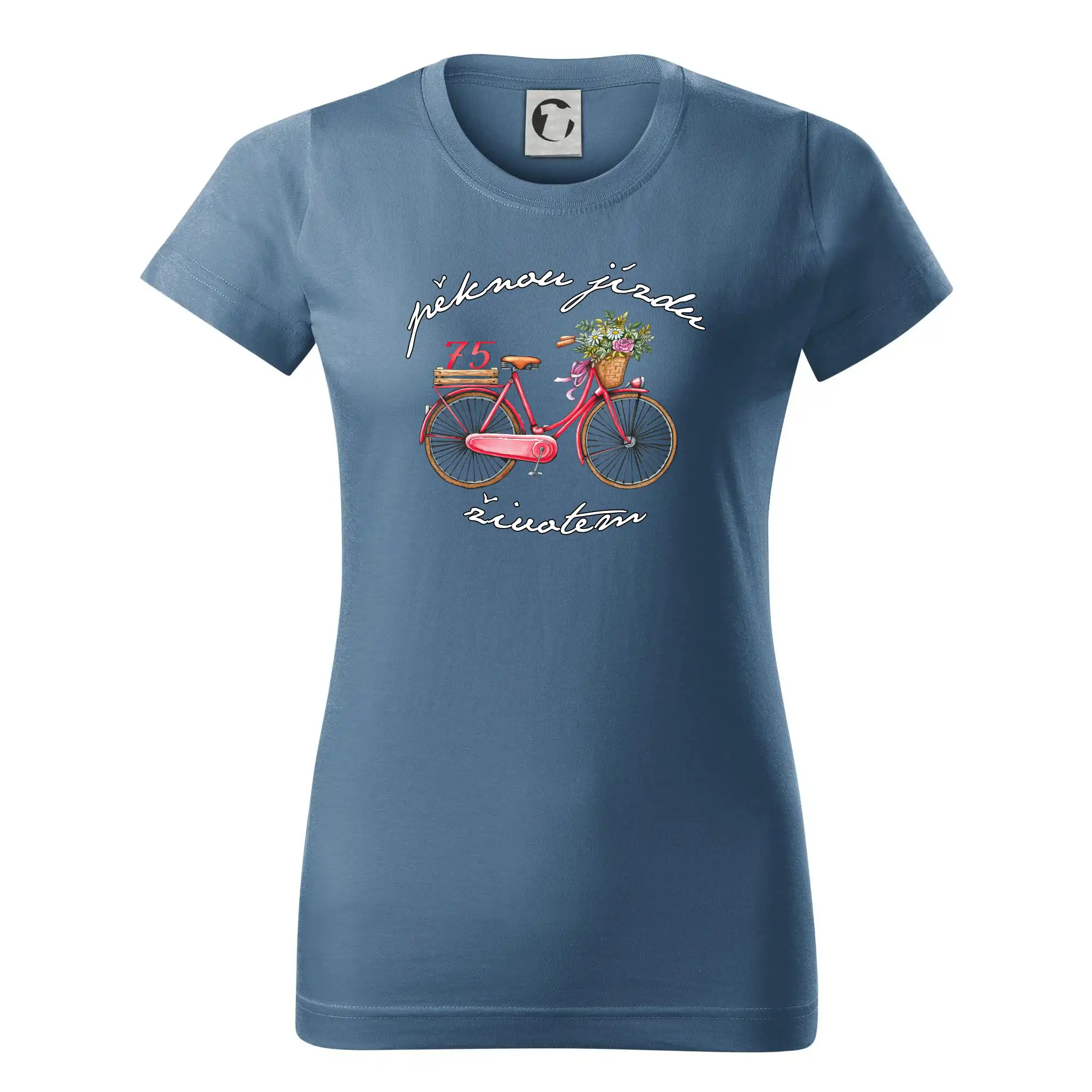 Narozeninové tričko pro babičku, která slaví 75 let, s motem "pěknou jízdu životem". Stylové jízdní kolo na triku jako dárek na 75 narozeniny pro ženu. Triko pro babičku, která slaví jubileum 75 let.