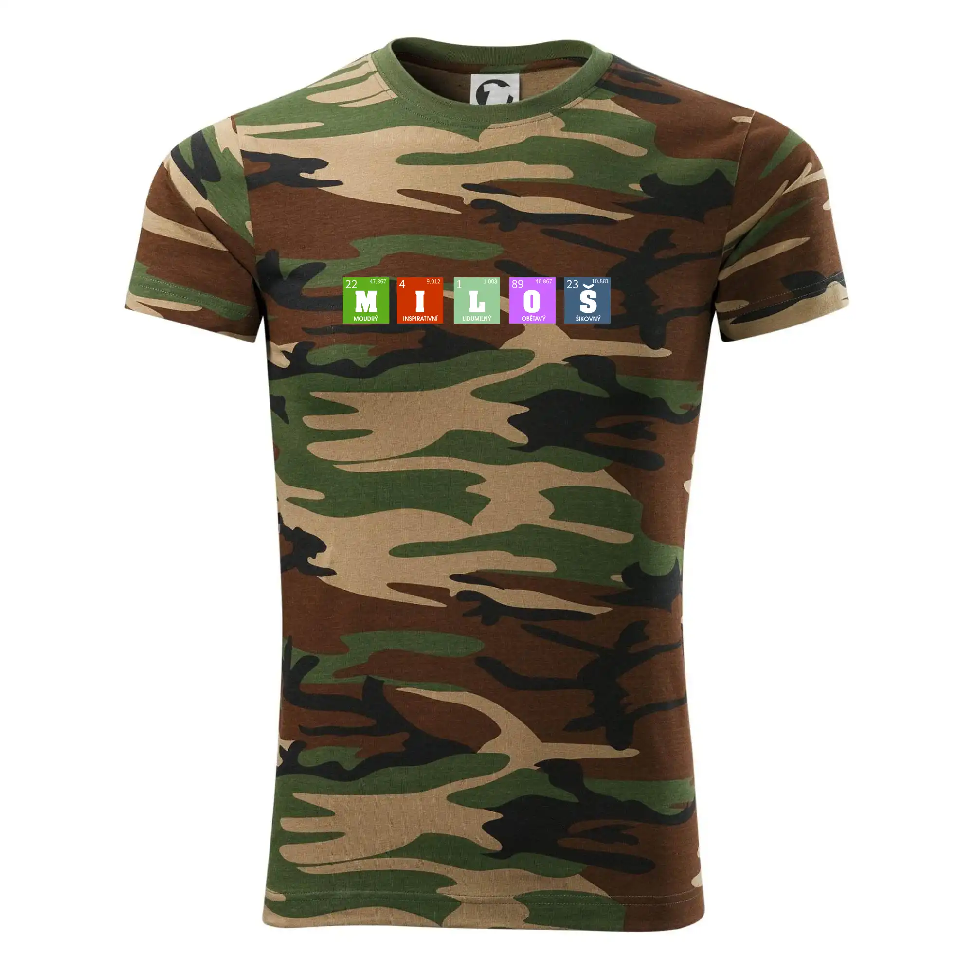 Tričko střední gramáže v barvách camouflage. Střih s bočními švy. Lem průkrčníku ze žebrového úpletu s přídavkem 5 % elastanu. Vnitřní část zadního průkrčníku začištěna páskou v barvě camouflage.