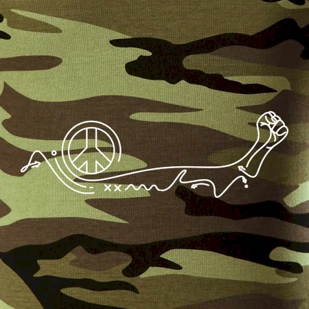 Tričko střední gramáže v barvách camouflage. Střih s bočními švy. Lem průkrčníku ze žebrového úpletu s přídavkem 5 % elastanu. Vnitřní část zadního průkrčníku začištěna páskou v barvě camouflage.