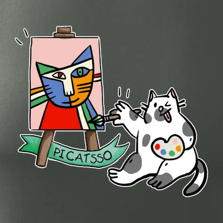 Tričko s kočkou která si věří, že je Pablo Picasso, vtipné triko s kočkou malířkou, která kreslí obraz. S trikem s kočkou nezkazíš žádnou srandu.