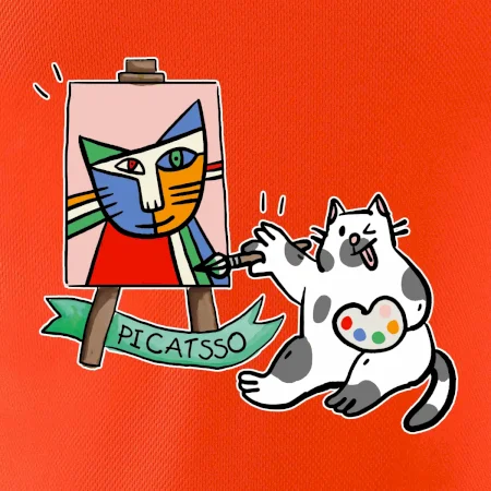 Tričko s kočkou která si věří, že je Pablo Picasso, vtipné triko s kočkou malířkou, která kreslí obraz. S trikem s kočkou nezkazíš žádnou srandu.