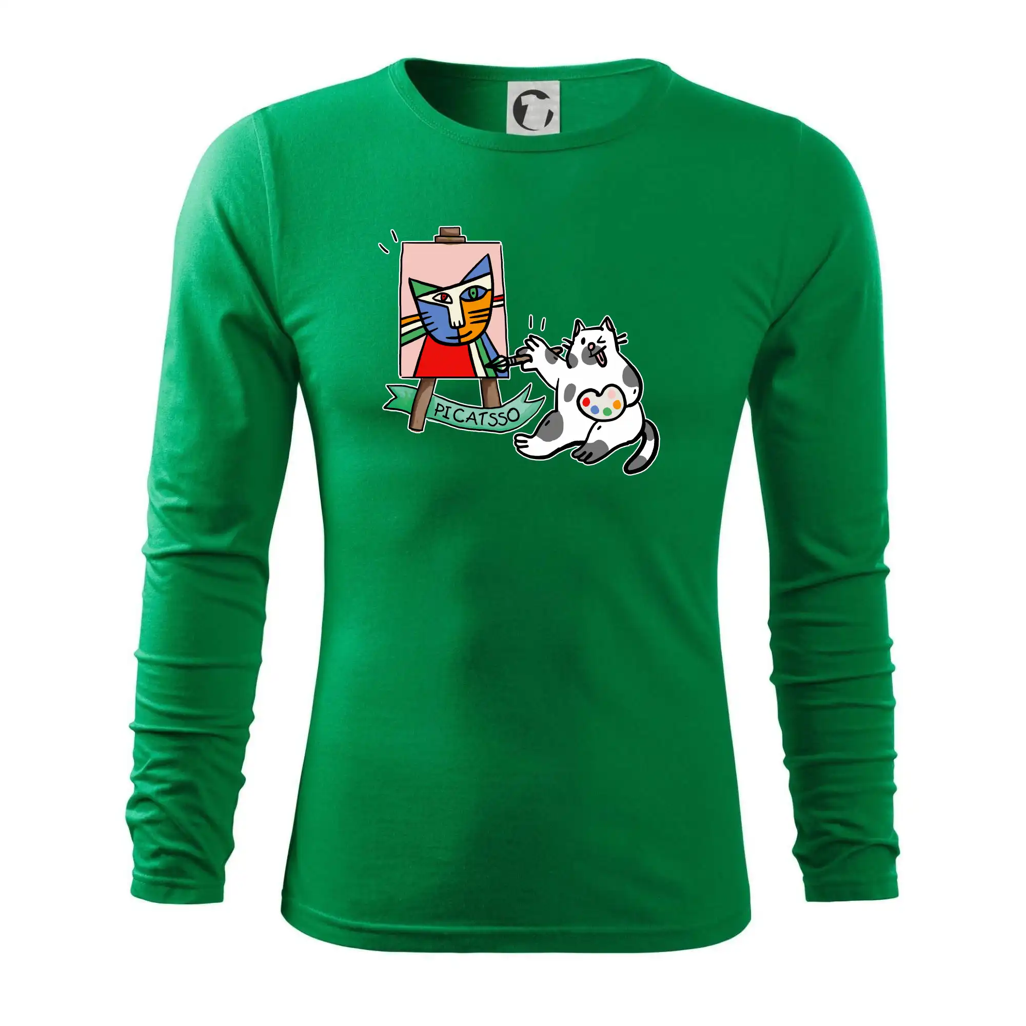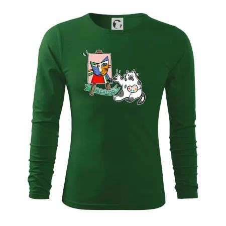 Tričko s kočkou která si věří, že je Pablo Picasso, vtipné triko s kočkou malířkou, která kreslí obraz. S trikem s kočkou nezkazíš žádnou srandu.