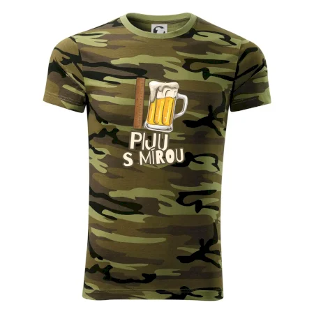 Tričko střední gramáže v barvách camouflage. Střih s bočními švy. Lem průkrčníku ze žebrového úpletu s přídavkem 5 % elastanu. Vnitřní část zadního průkrčníku začištěna páskou v barvě camouflage.