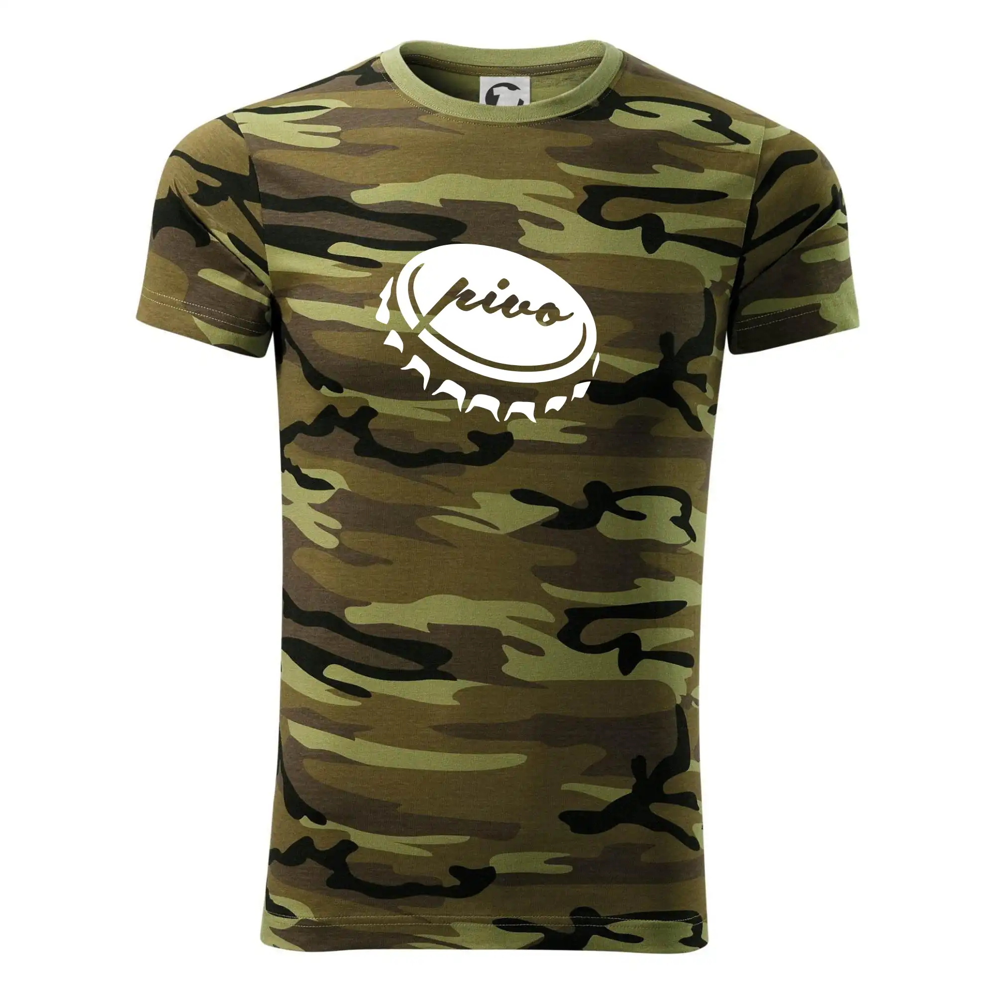 Tričko střední gramáže v barvách camouflage. Střih s bočními švy. Lem průkrčníku ze žebrového úpletu s přídavkem 5 % elastanu. Vnitřní část zadního průkrčníku začištěna páskou v barvě camouflage.