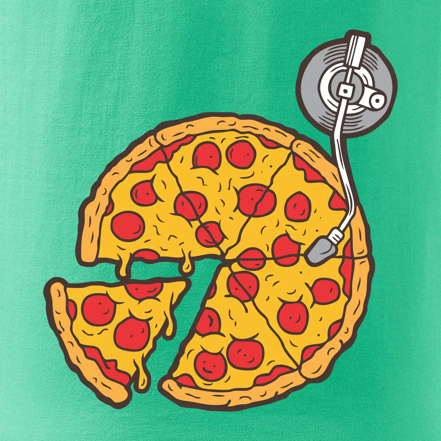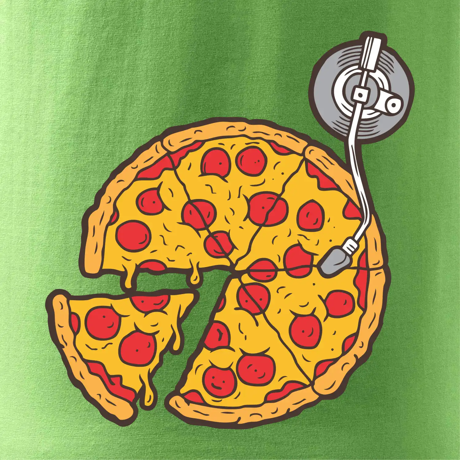 Triko pro dýdžeje, který miluje pizzu a hudba je jeho život. Na triku je totiž pizza místo desky na mixážním pultu. Dárek pro dýdžeje tě potěší pokud jsi DJ celým srdcem. Gramofonová deska zmizela, místo ní obsadila gramofon pizza.