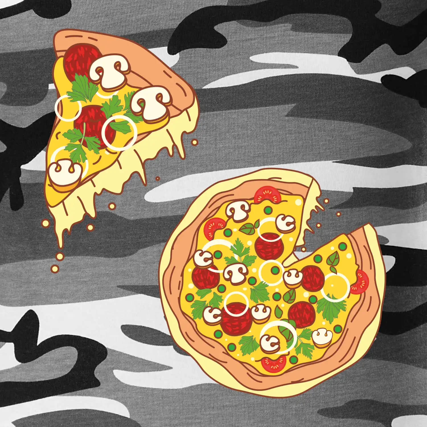 Tričko střední gramáže v barvách camouflage. Střih s bočními švy. Lem průkrčníku ze žebrového úpletu s přídavkem 5 % elastanu. Vnitřní část zadního průkrčníku začištěna páskou v barvě camouflage.