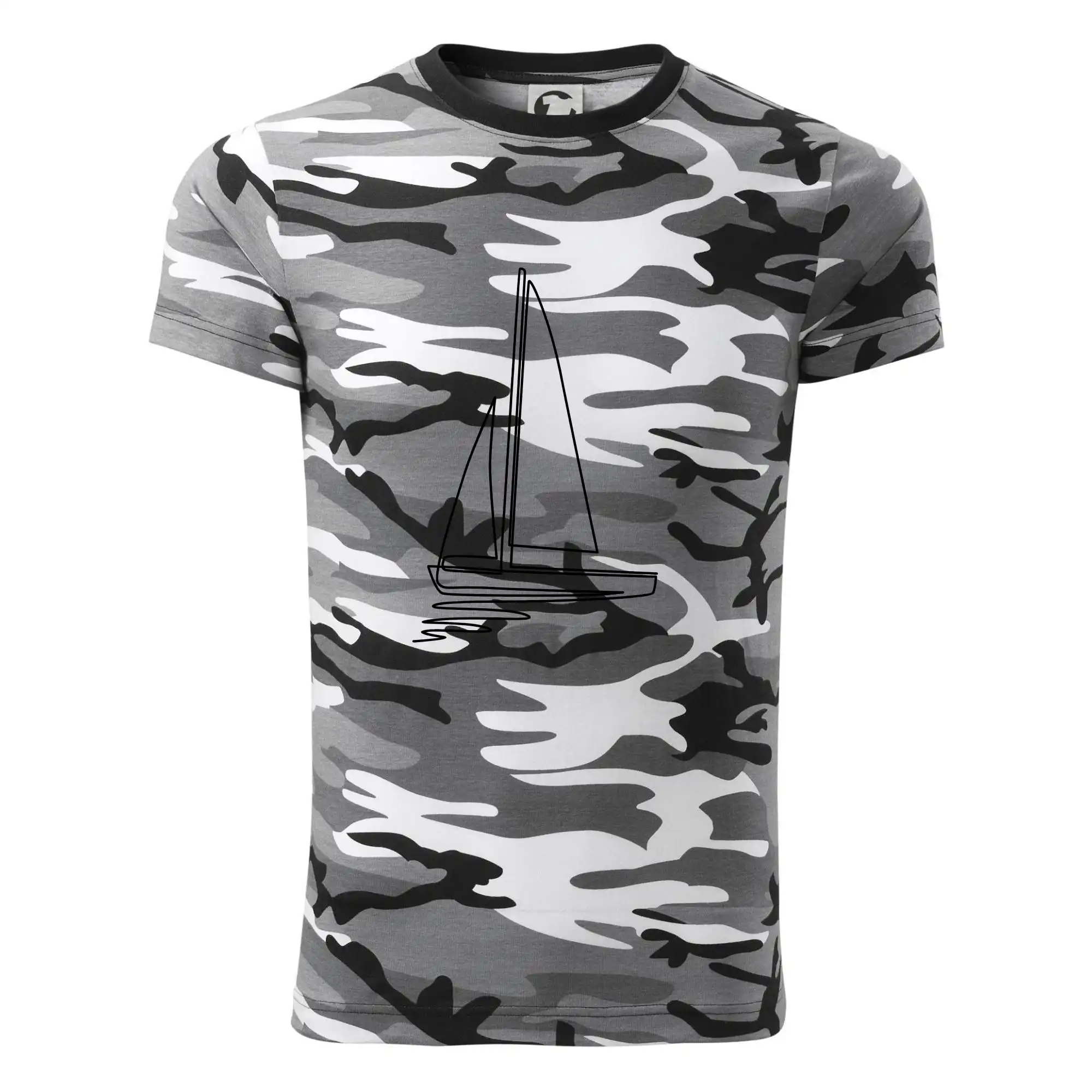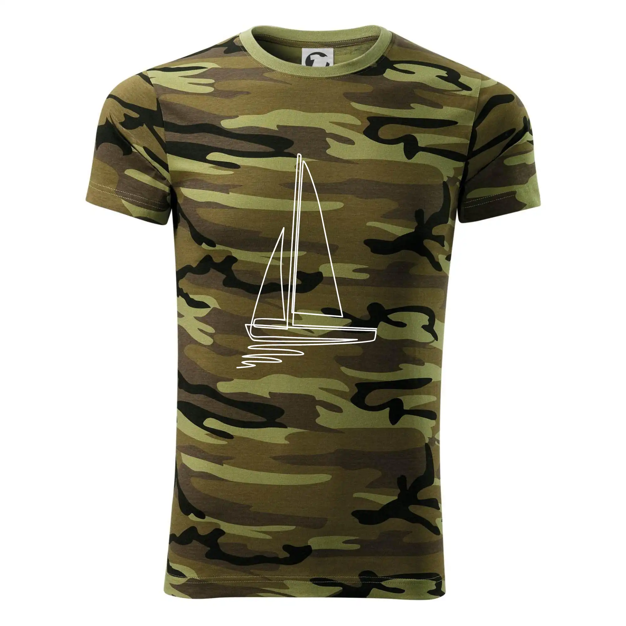 Tričko střední gramáže v barvách camouflage. Střih s bočními švy. Lem průkrčníku ze žebrového úpletu s přídavkem 5 % elastanu. Vnitřní část zadního průkrčníku začištěna páskou v barvě camouflage.