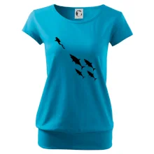 Trendové dámské triko s velmi krátkým rukávem, volnějšího střihu, v dolním kraji všité do širokého lemu. Kulatý průkrčník s úzkým lemem ze shodného materiálu.