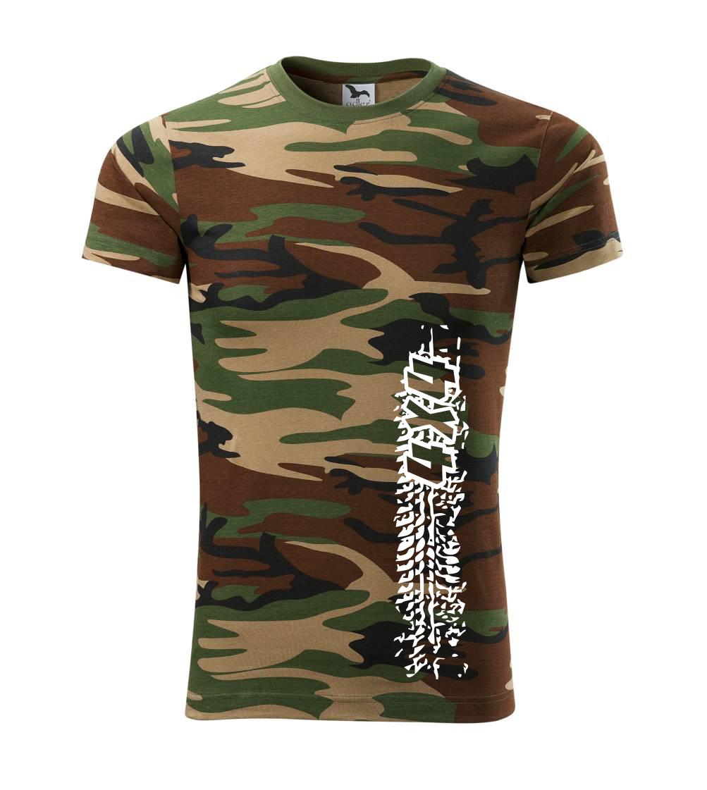 Tričko střední gramáže v barvách camouflage. Střih s bočními švy. Lem průkrčníku ze žebrového úpletu s přídavkem 5 % elastanu. Vnitřní část zadního průkrčníku začištěna páskou v barvě camouflage.
