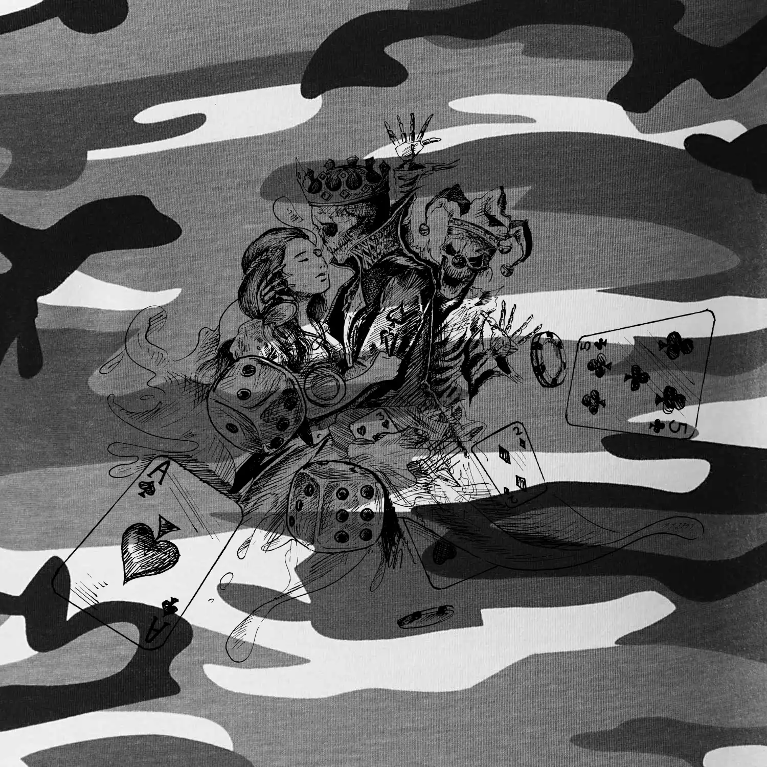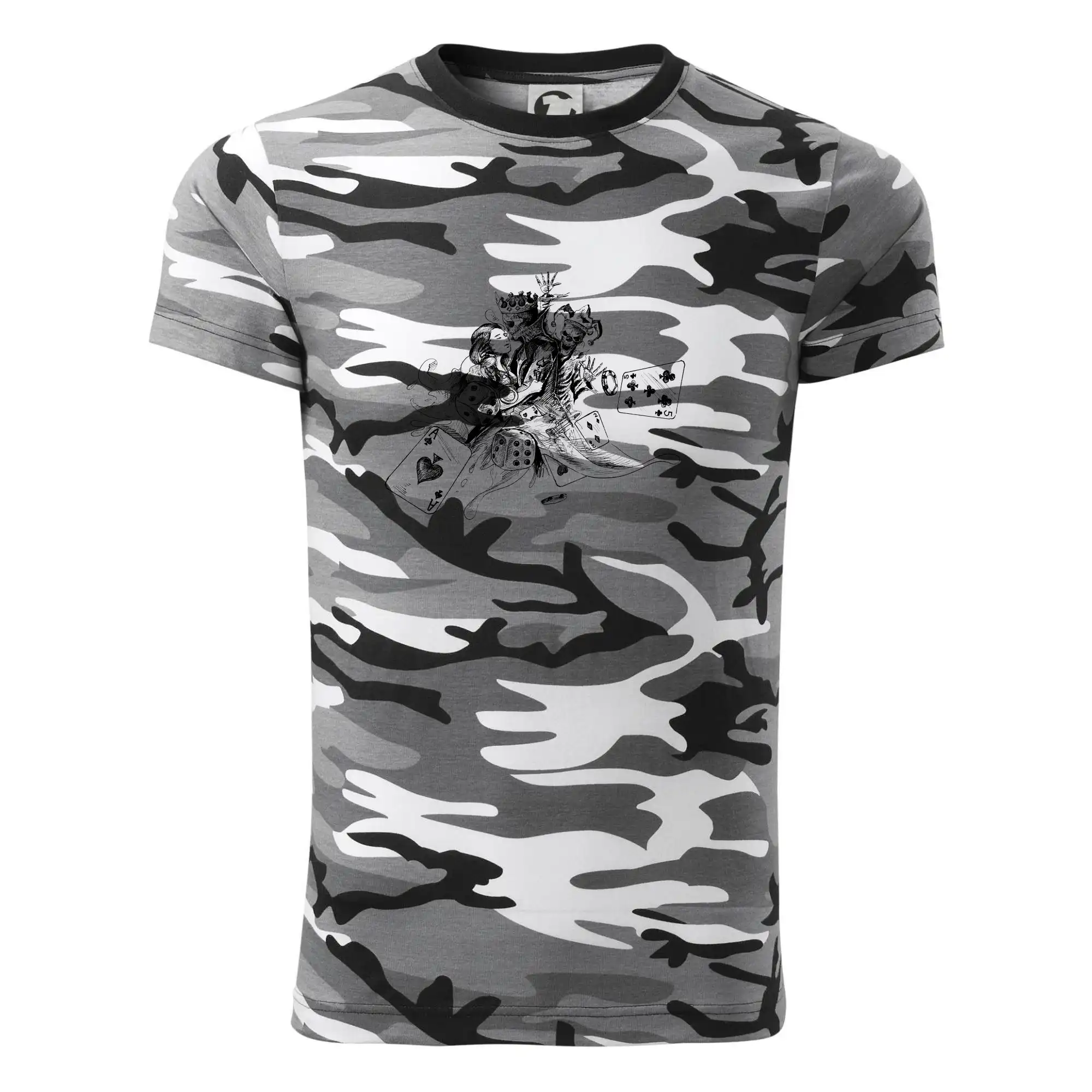Tričko střední gramáže v barvách camouflage. Střih s bočními švy. Lem průkrčníku ze žebrového úpletu s přídavkem 5 % elastanu. Vnitřní část zadního průkrčníku začištěna páskou v barvě camouflage.