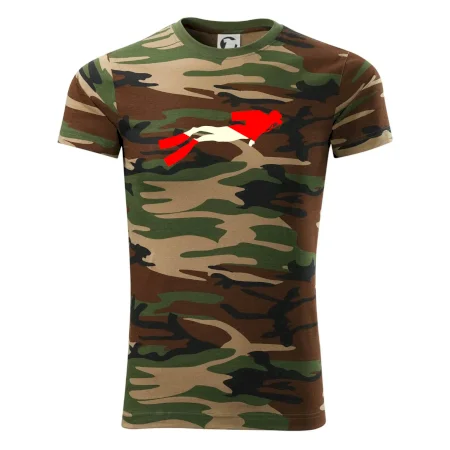 Tričko střední gramáže v barvách camouflage. Střih s bočními švy. Lem průkrčníku ze žebrového úpletu s přídavkem 5 % elastanu. Vnitřní část zadního průkrčníku začištěna páskou v barvě camouflage.