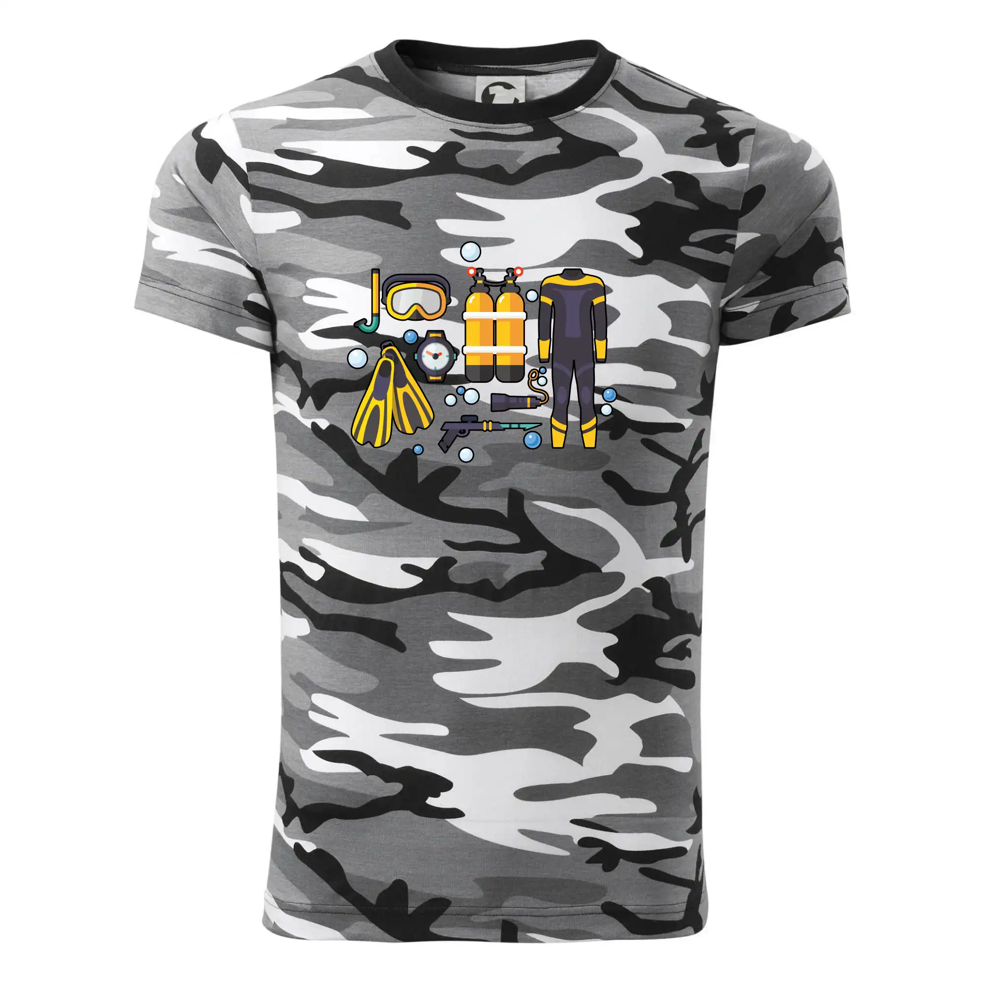 Tričko střední gramáže v barvách camouflage. Střih s bočními švy. Lem průkrčníku ze žebrového úpletu s přídavkem 5 % elastanu. Vnitřní část zadního průkrčníku začištěna páskou v barvě camouflage.