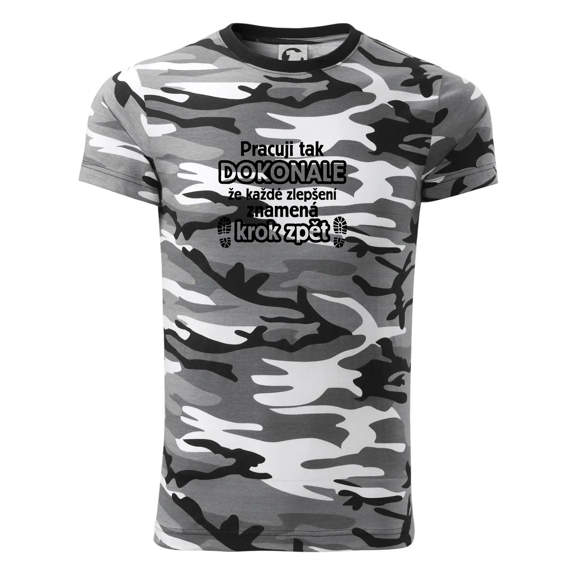 Tričko střední gramáže v barvách camouflage. Střih s bočními švy. Lem průkrčníku ze žebrového úpletu s přídavkem 5 % elastanu. Vnitřní část zadního průkrčníku začištěna páskou v barvě camouflage.
