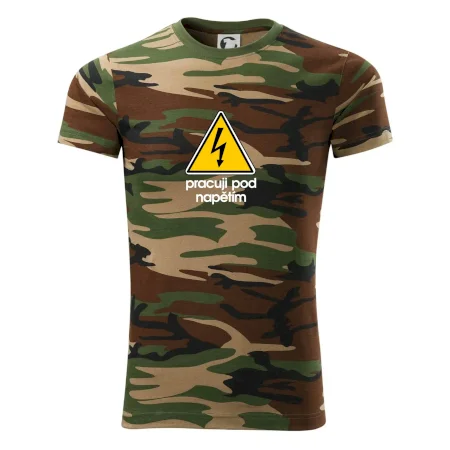 Tričko střední gramáže v barvách camouflage. Střih s bočními švy. Lem průkrčníku ze žebrového úpletu s přídavkem 5 % elastanu. Vnitřní část zadního průkrčníku začištěna páskou v barvě camouflage.