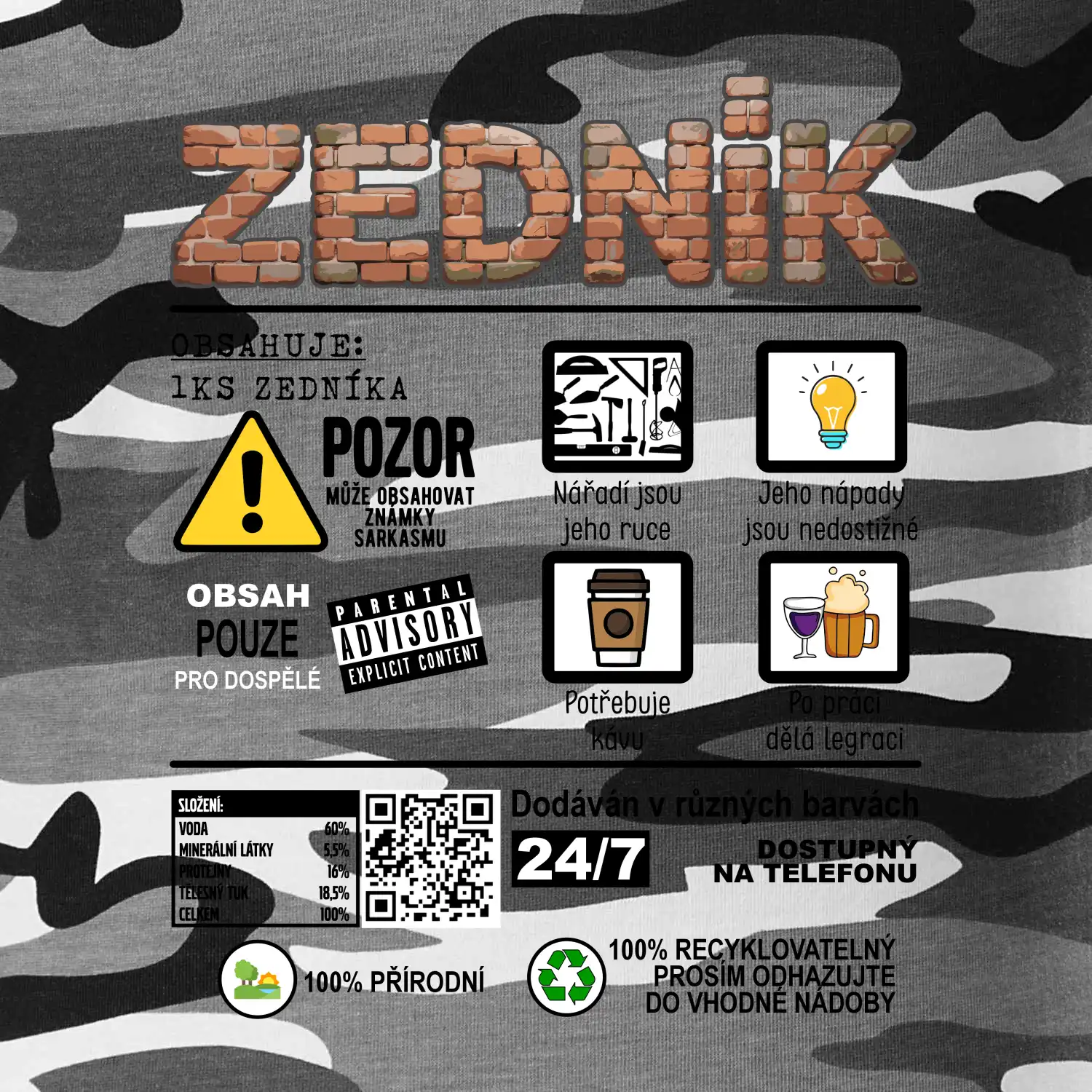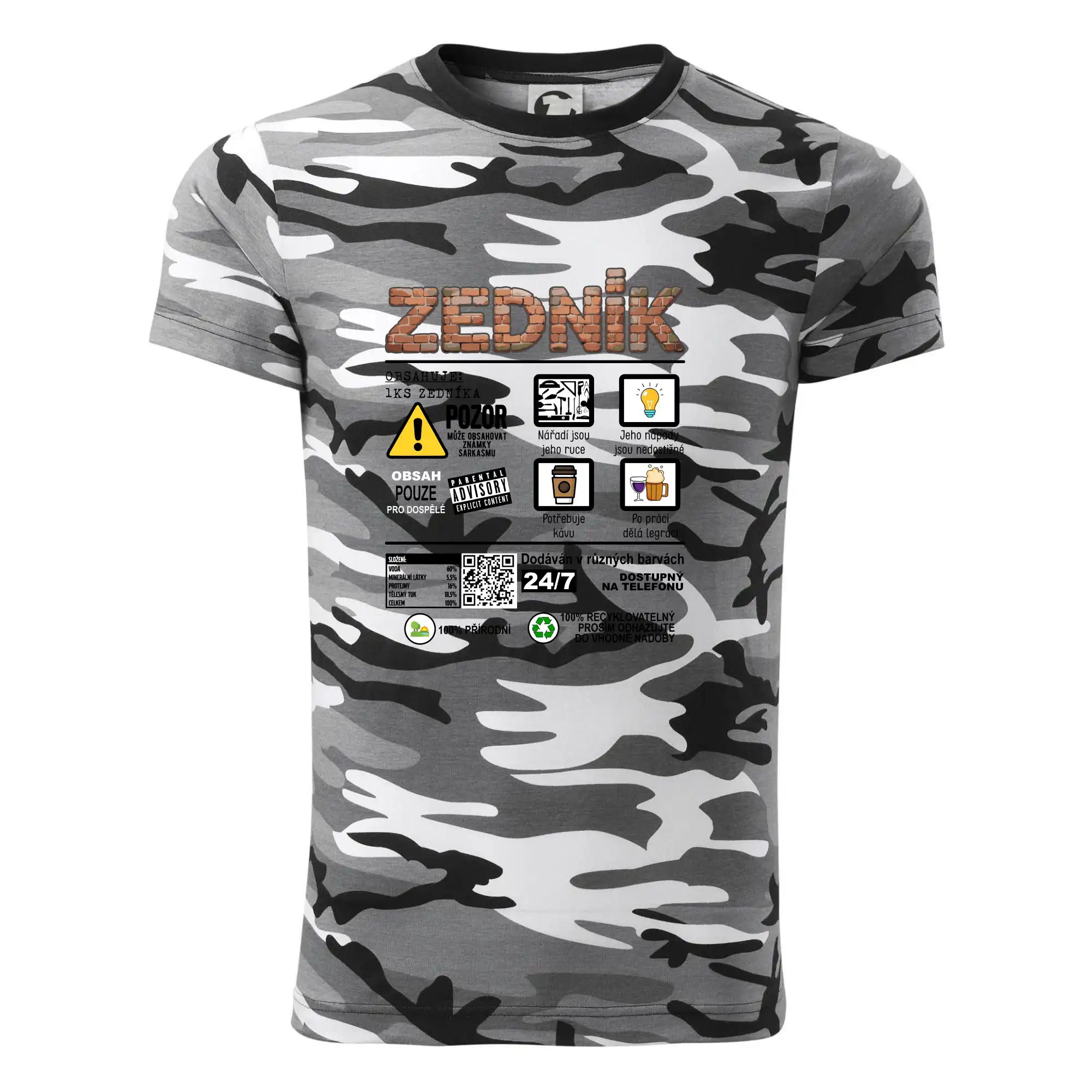 Tričko střední gramáže v barvách camouflage. Střih s bočními švy. Lem průkrčníku ze žebrového úpletu s přídavkem 5 % elastanu. Vnitřní část zadního průkrčníku začištěna páskou v barvě camouflage.