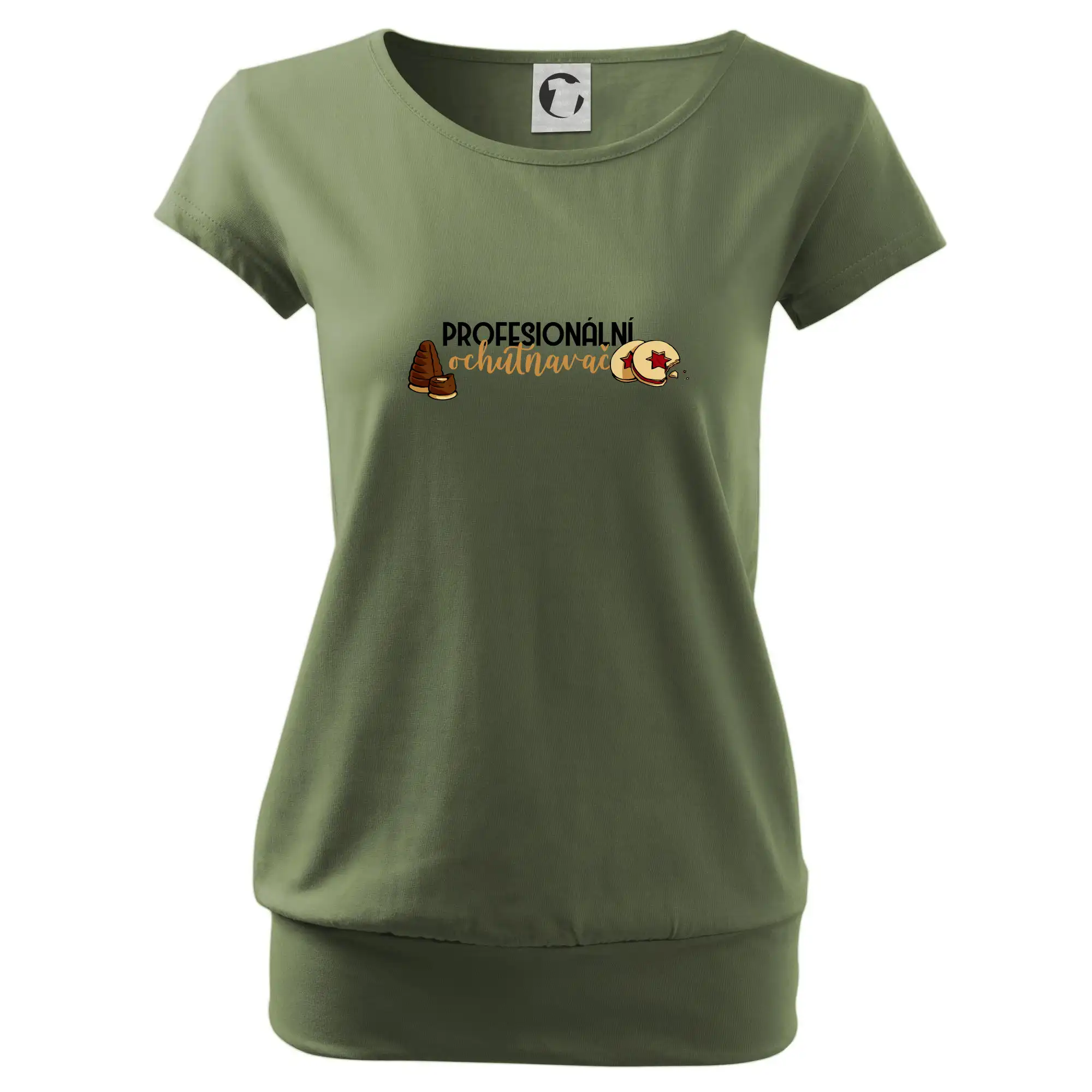Trendové dámské triko s velmi krátkým rukávem, volnějšího střihu, v dolním kraji všité do širokého lemu. Kulatý průkrčník s úzkým lemem ze shodného materiálu.