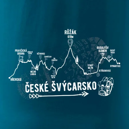 České Švýcarsko je prý nejhezčí místo u nás! Triko pro turistu a milovníka přírody. Projdi si celou cestu podle trika - Hřensko, Pravčická brána, Křídelní stěna, Mezní louka, Větrovec, Šaunštejn, Na Zámečku, Růžák, Starý mlýn, Rudolfův kámen, Jetřichovice, Suchý vrch, Rynartice. Sbal batoh a vyraz na výlet!