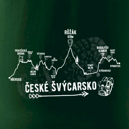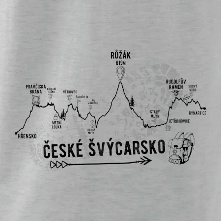České Švýcarsko je prý nejhezčí místo u nás! Triko pro turistu a milovníka přírody. Projdi si celou cestu podle trika - Hřensko, Pravčická brána, Křídelní stěna, Mezní louka, Větrovec, Šaunštejn, Na Zámečku, Růžák, Starý mlýn, Rudolfův kámen, Jetřichovice, Suchý vrch, Rynartice. Sbal batoh a vyraz na výlet!