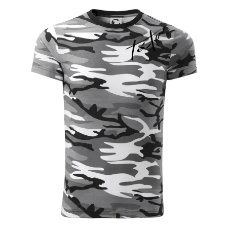 Tričko střední gramáže v barvách camouflage. Střih s bočními švy. Lem průkrčníku ze žebrového úpletu s přídavkem 5 % elastanu. Vnitřní část zadního průkrčníku začištěna páskou v barvě camouflage.
