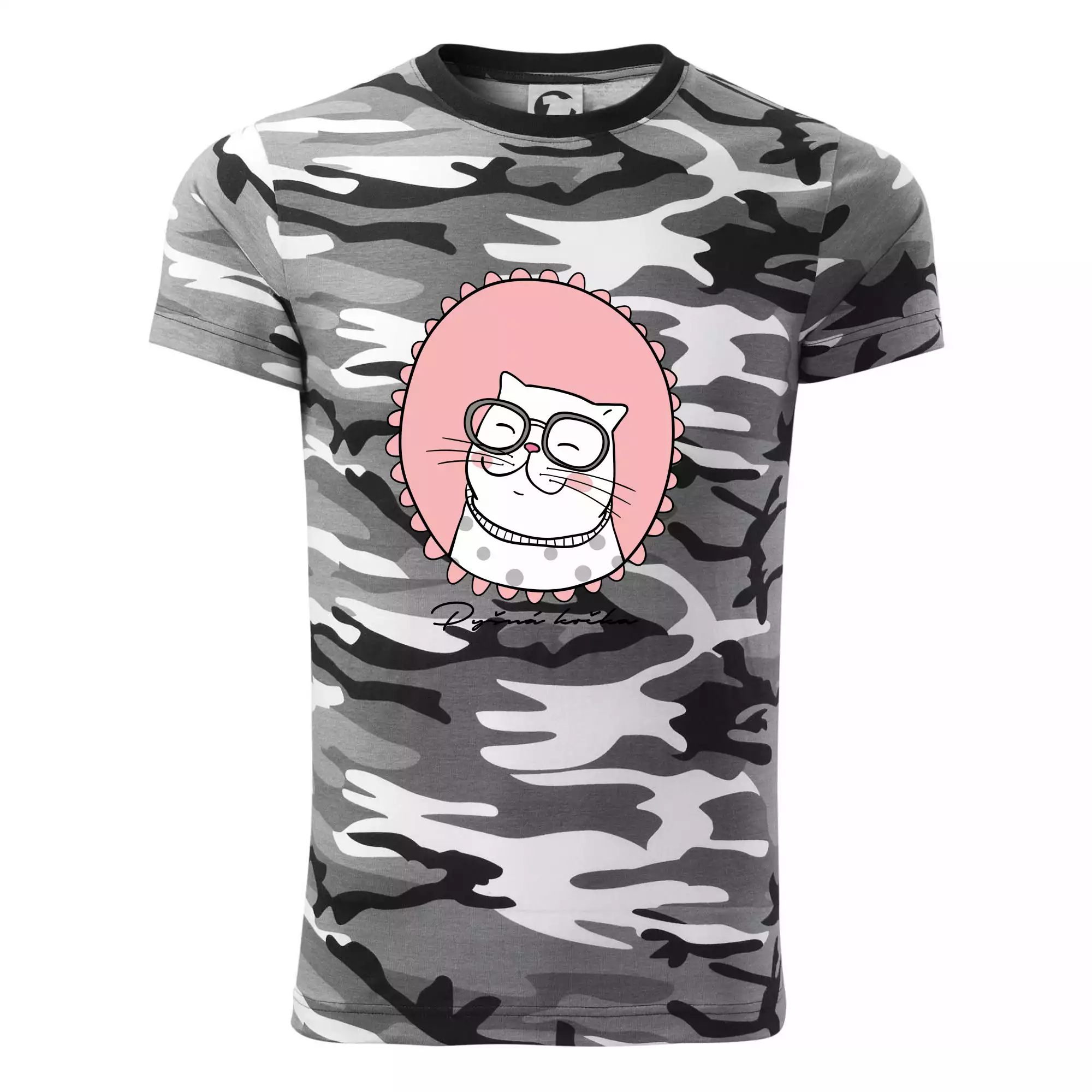 Tričko střední gramáže v barvách camouflage. Střih s bočními švy. Lem průkrčníku ze žebrového úpletu s přídavkem 5 % elastanu. Vnitřní část zadního průkrčníku začištěna páskou v barvě camouflage.