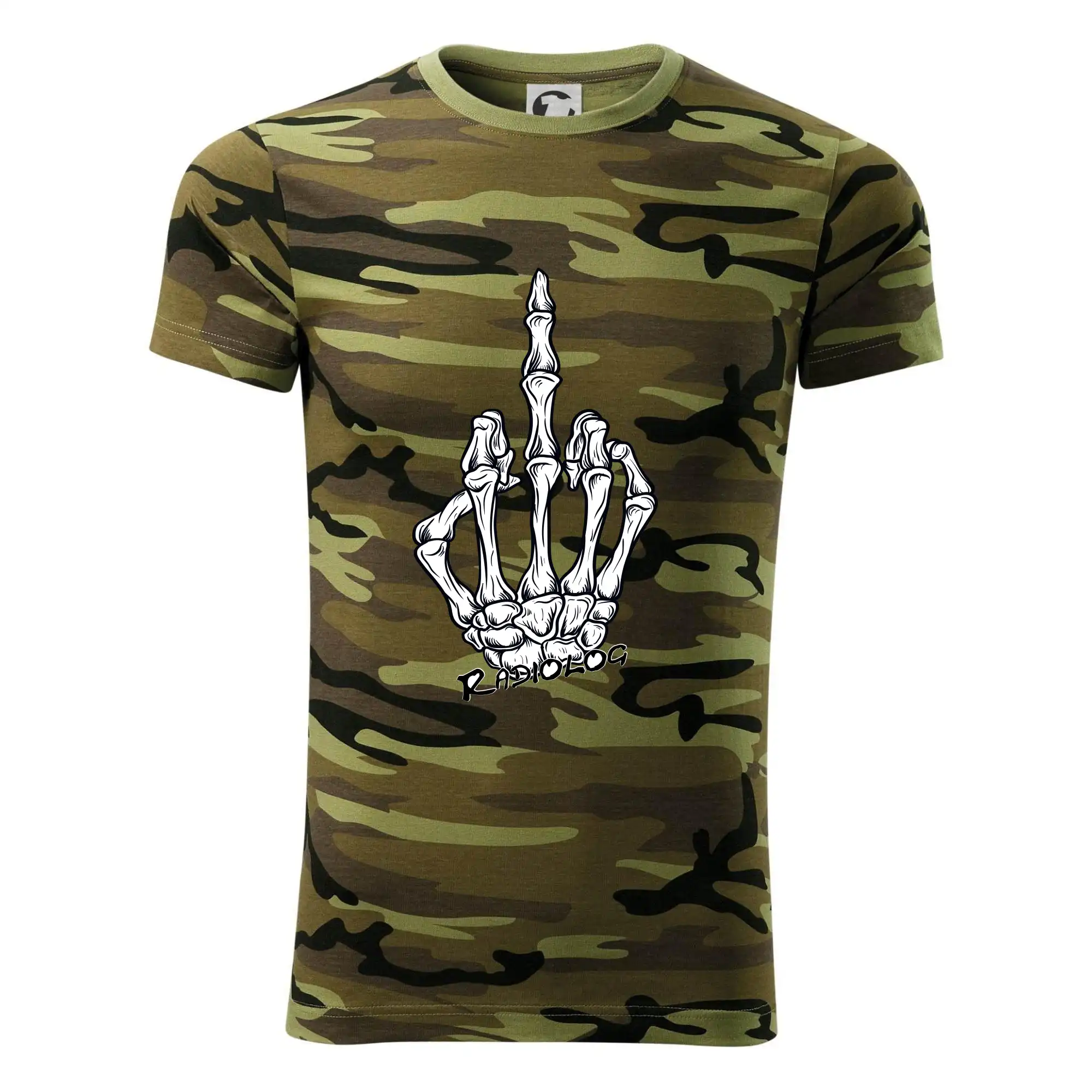 Tričko střední gramáže v barvách camouflage. Střih s bočními švy. Lem průkrčníku ze žebrového úpletu s přídavkem 5 % elastanu. Vnitřní část zadního průkrčníku začištěna páskou v barvě camouflage.