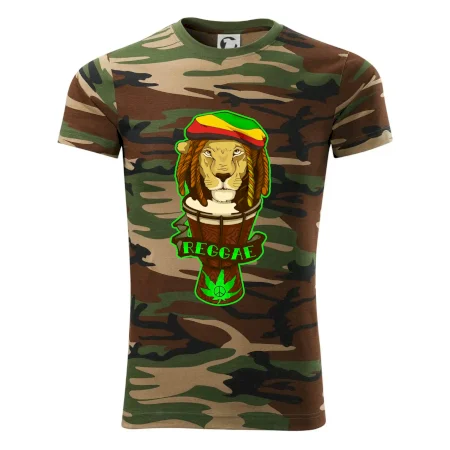 Tričko střední gramáže v barvách camouflage. Střih s bočními švy. Lem průkrčníku ze žebrového úpletu s přídavkem 5 % elastanu. Vnitřní část zadního průkrčníku začištěna páskou v barvě camouflage.