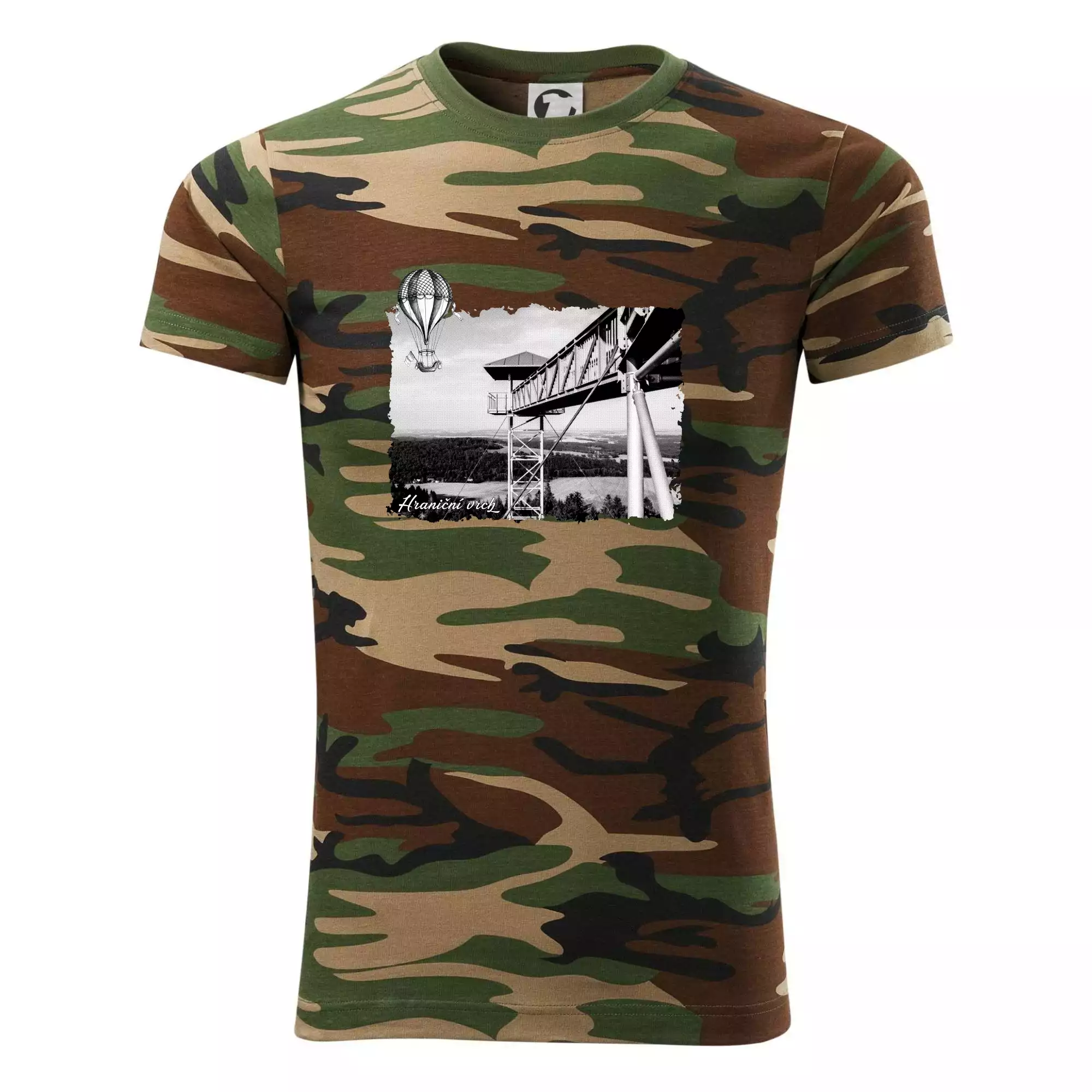 Tričko střední gramáže v barvách camouflage. Střih s bočními švy. Lem průkrčníku ze žebrového úpletu s přídavkem 5 % elastanu. Vnitřní část zadního průkrčníku začištěna páskou v barvě camouflage.