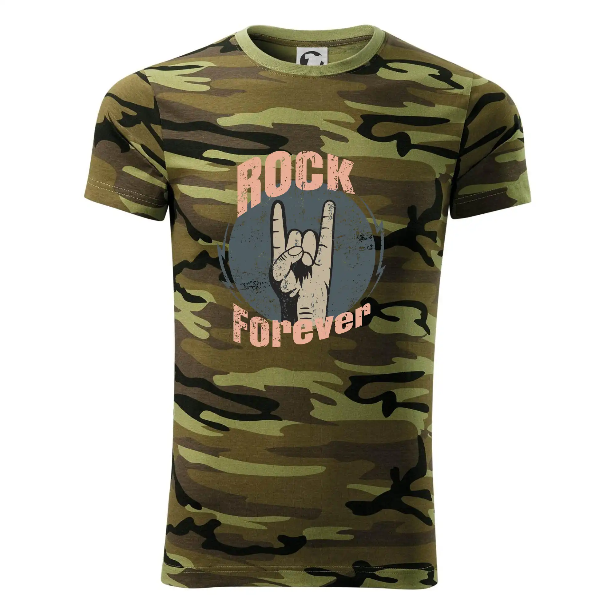 Tričko střední gramáže v barvách camouflage. Střih s bočními švy. Lem průkrčníku ze žebrového úpletu s přídavkem 5 % elastanu. Vnitřní část zadního průkrčníku začištěna páskou v barvě camouflage.