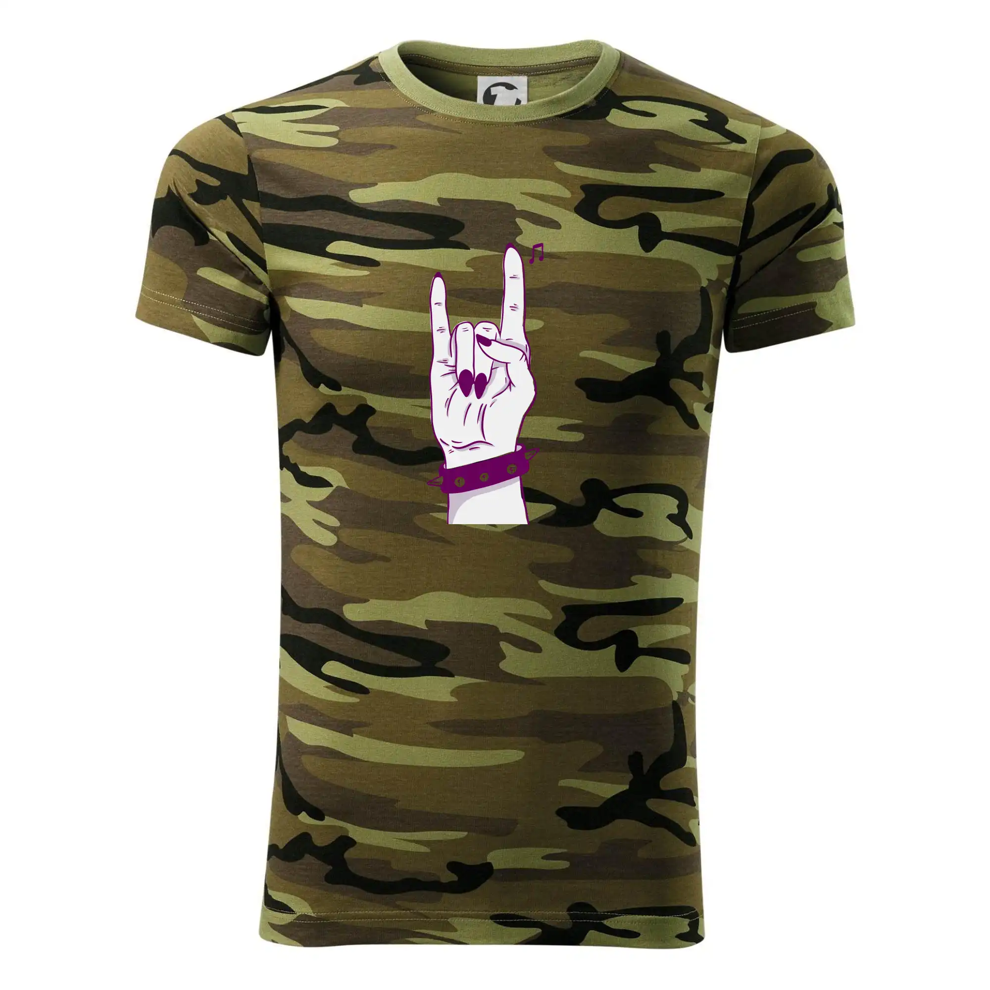 Tričko střední gramáže v barvách camouflage. Střih s bočními švy. Lem průkrčníku ze žebrového úpletu s přídavkem 5 % elastanu. Vnitřní část zadního průkrčníku začištěna páskou v barvě camouflage.