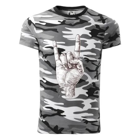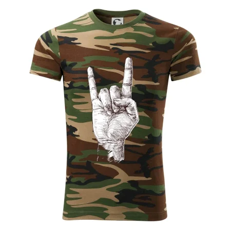Tričko střední gramáže v barvách camouflage. Střih s bočními švy. Lem průkrčníku ze žebrového úpletu s přídavkem 5 % elastanu. Vnitřní část zadního průkrčníku začištěna páskou v barvě camouflage.