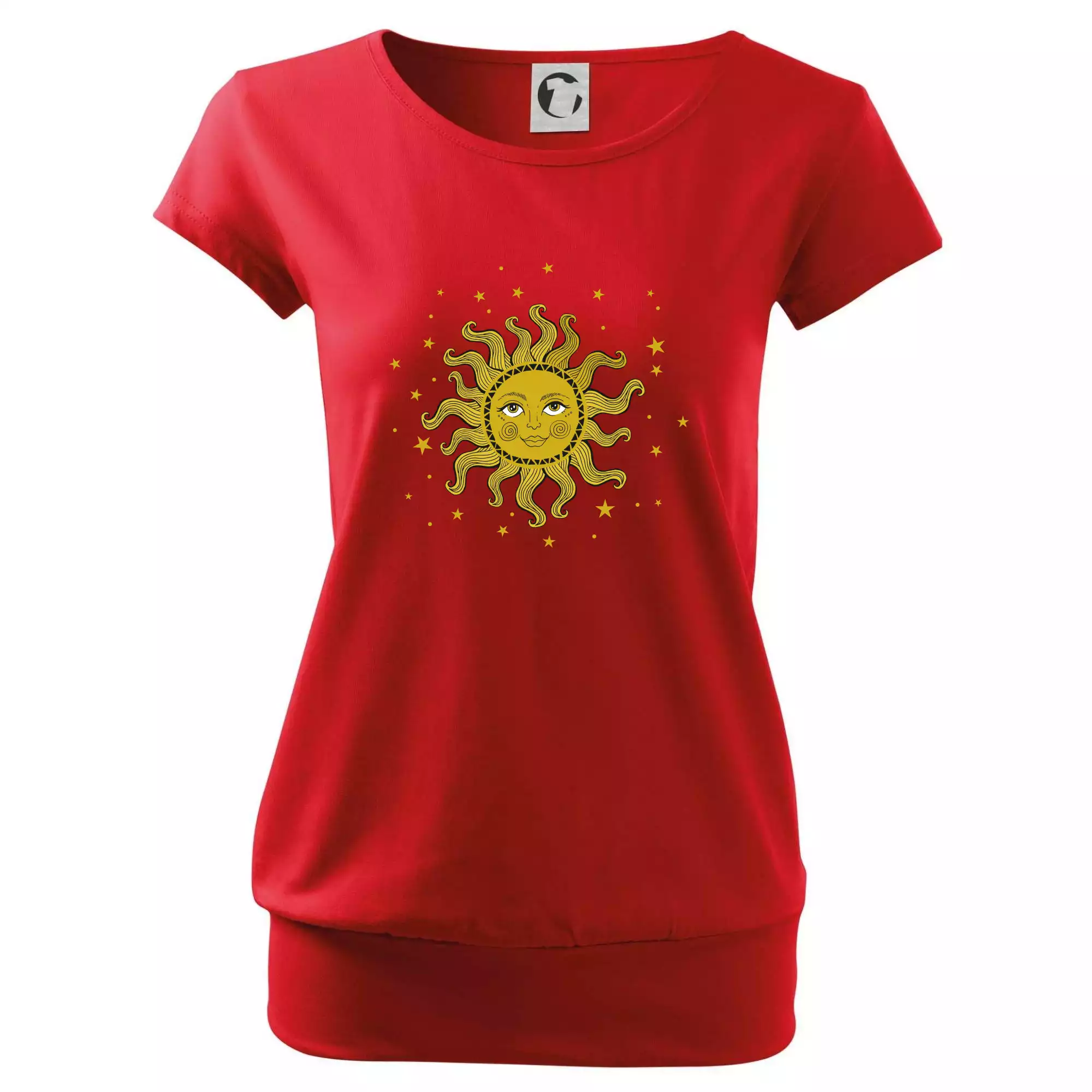 Trendové dámské triko s velmi krátkým rukávem, volnějšího střihu, v dolním kraji všité do širokého lemu. Kulatý průkrčník s úzkým lemem ze shodného materiálu.