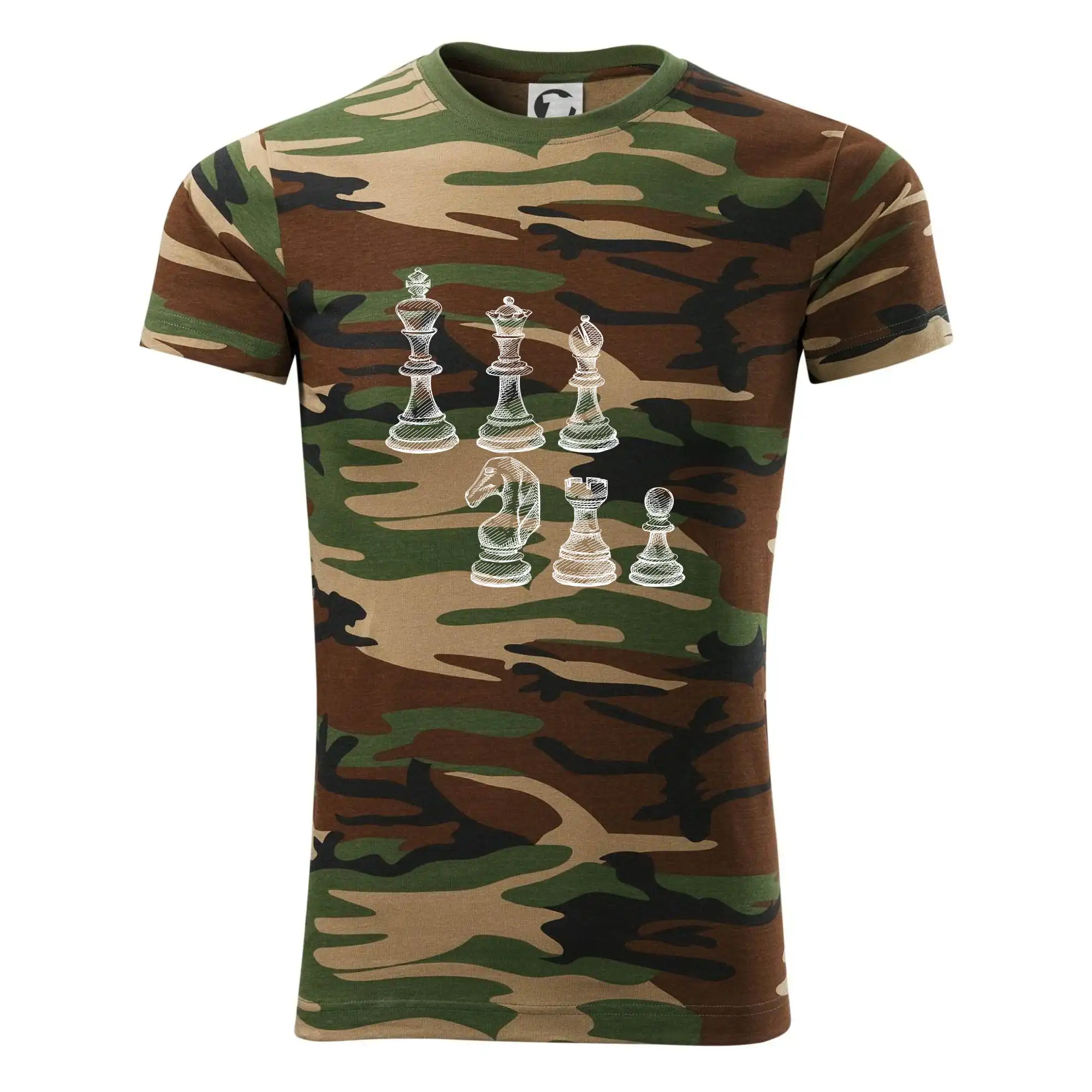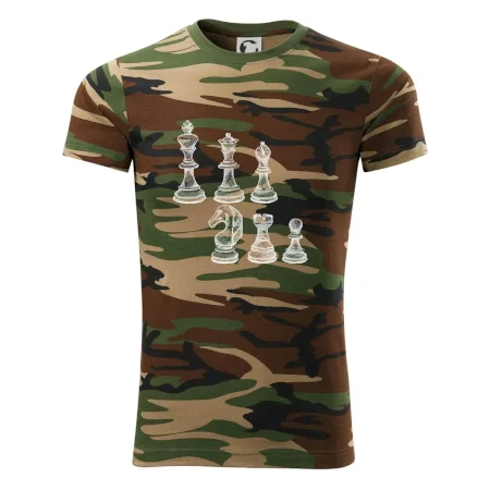 Tričko střední gramáže v barvách camouflage. Střih s bočními švy. Lem průkrčníku ze žebrového úpletu s přídavkem 5 % elastanu. Vnitřní část zadního průkrčníku začištěna páskou v barvě camouflage.
