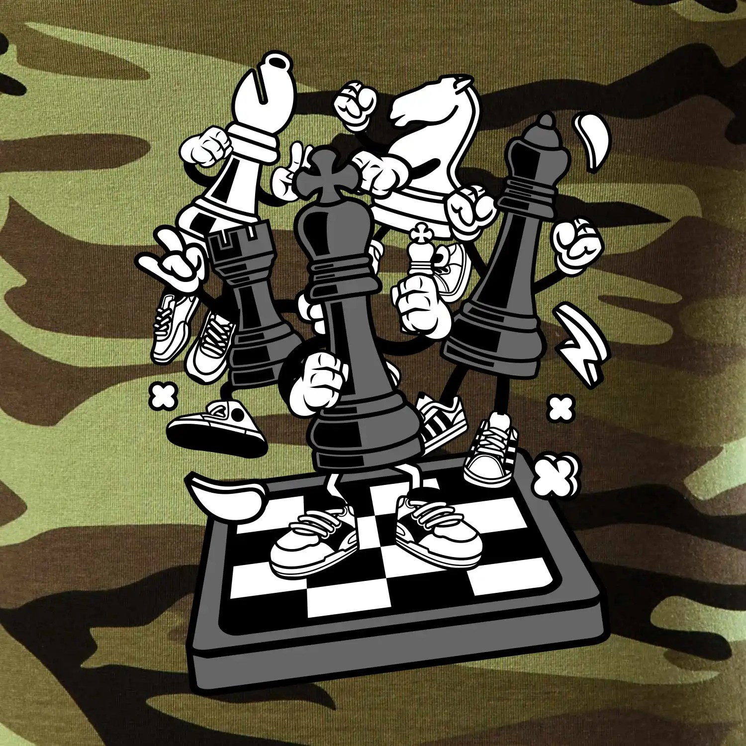 Tričko střední gramáže v barvách camouflage. Střih s bočními švy. Lem průkrčníku ze žebrového úpletu s přídavkem 5 % elastanu. Vnitřní část zadního průkrčníku začištěna páskou v barvě camouflage.