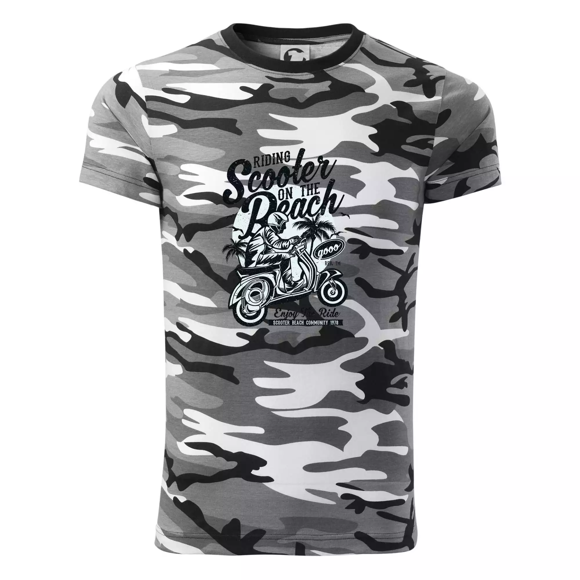 Tričko střední gramáže v barvách camouflage. Střih s bočními švy. Lem průkrčníku ze žebrového úpletu s přídavkem 5 % elastanu. Vnitřní část zadního průkrčníku začištěna páskou v barvě camouflage.