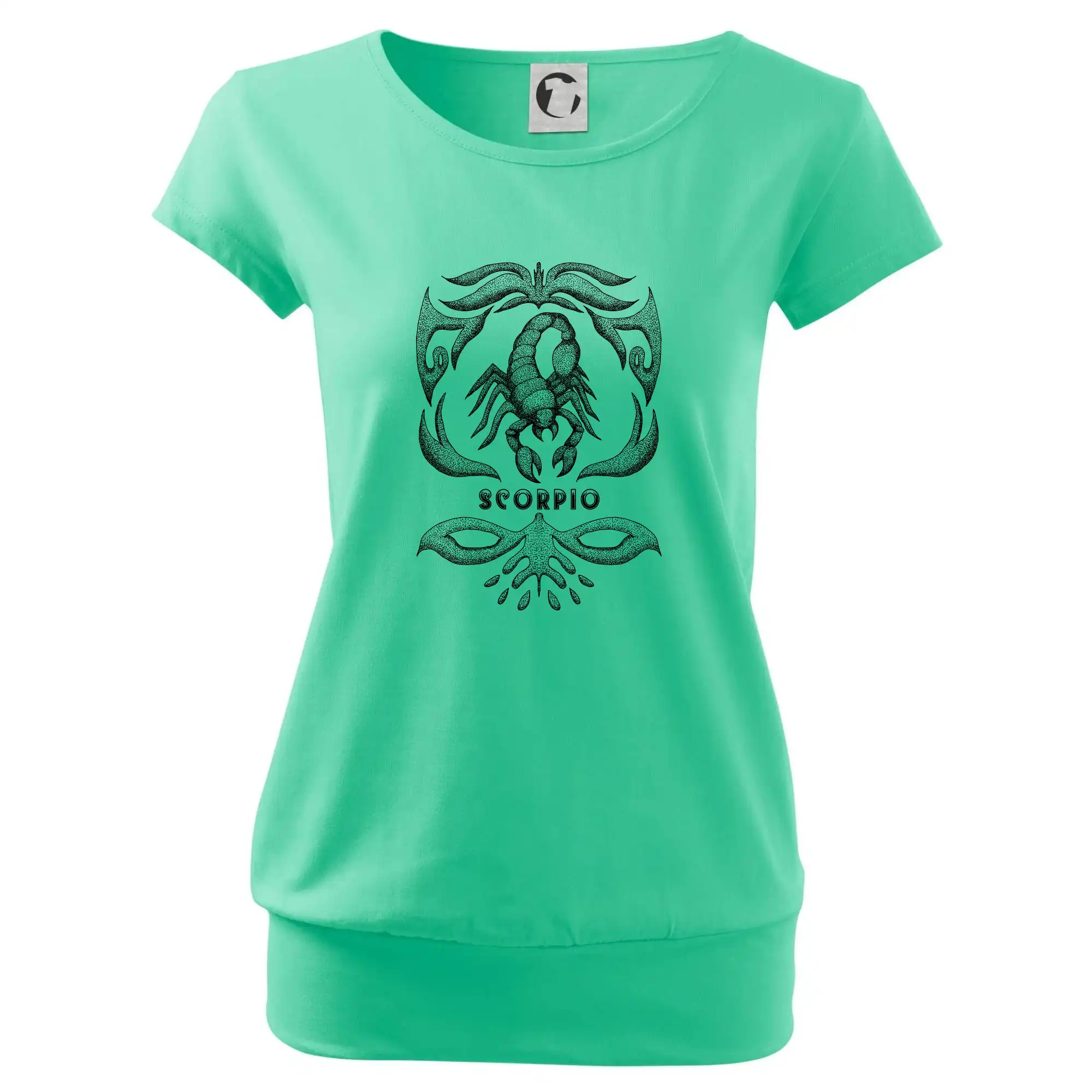 Trendové dámské triko s velmi krátkým rukávem, volnějšího střihu, v dolním kraji všité do širokého lemu. Kulatý průkrčník s úzkým lemem ze shodného materiálu.