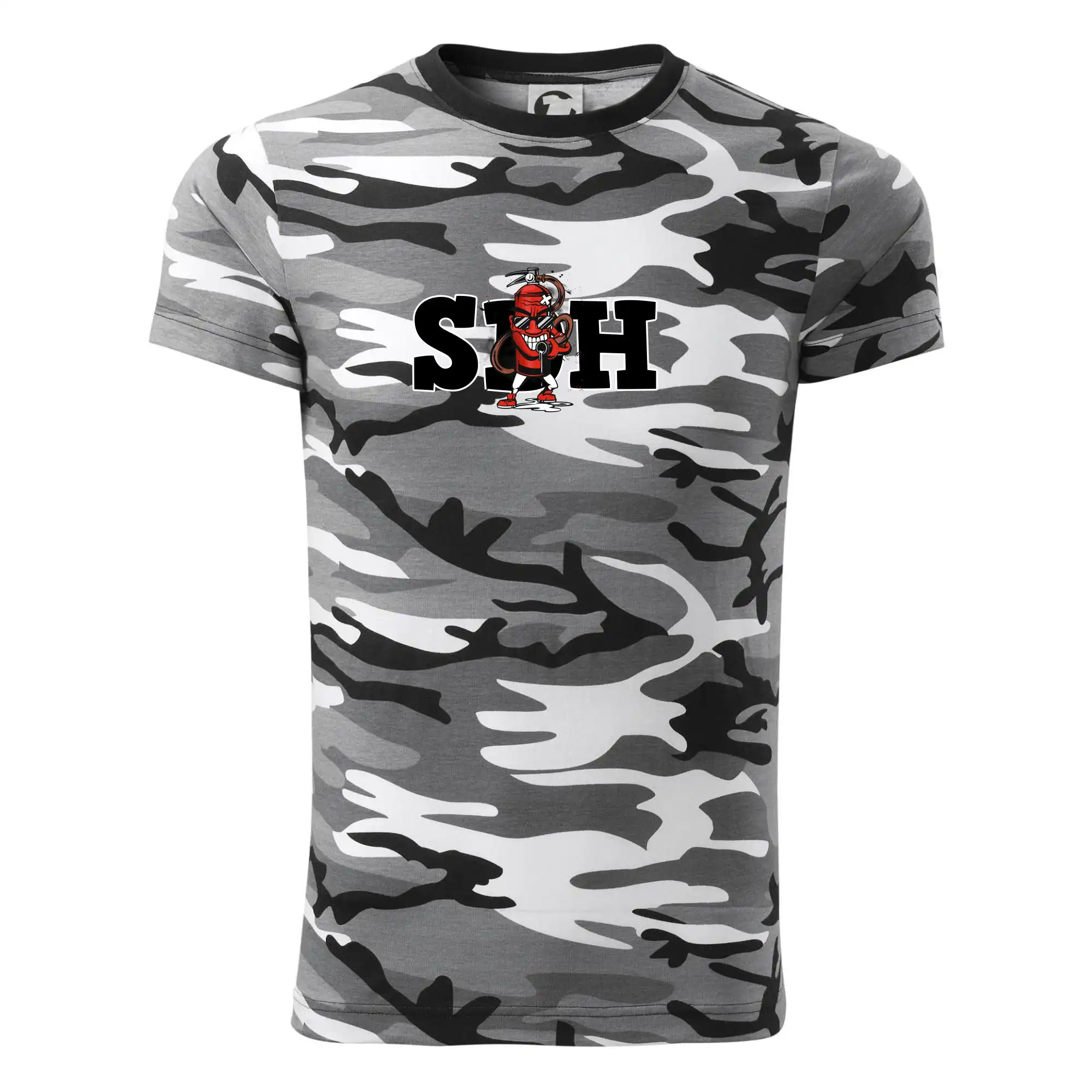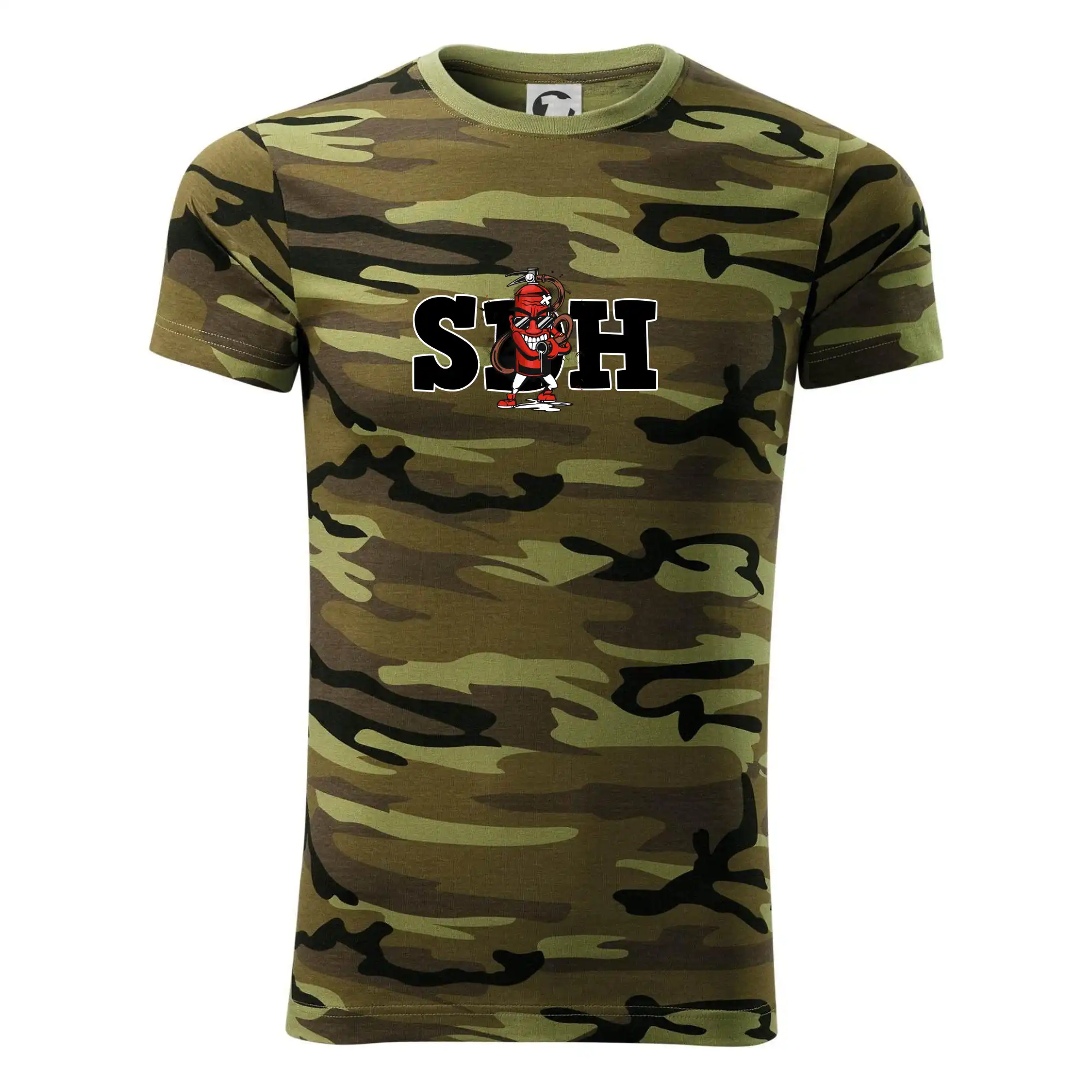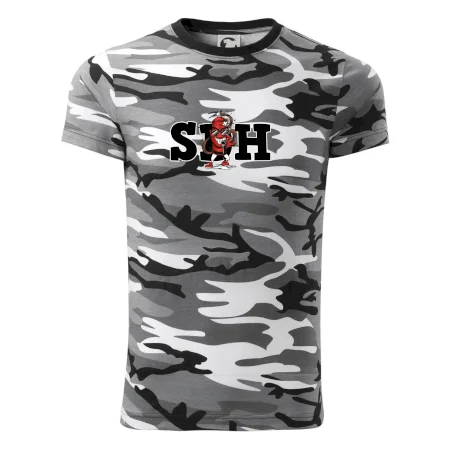 Tričko střední gramáže v barvách camouflage. Střih s bočními švy. Lem průkrčníku ze žebrového úpletu s přídavkem 5 % elastanu. Vnitřní část zadního průkrčníku začištěna páskou v barvě camouflage.