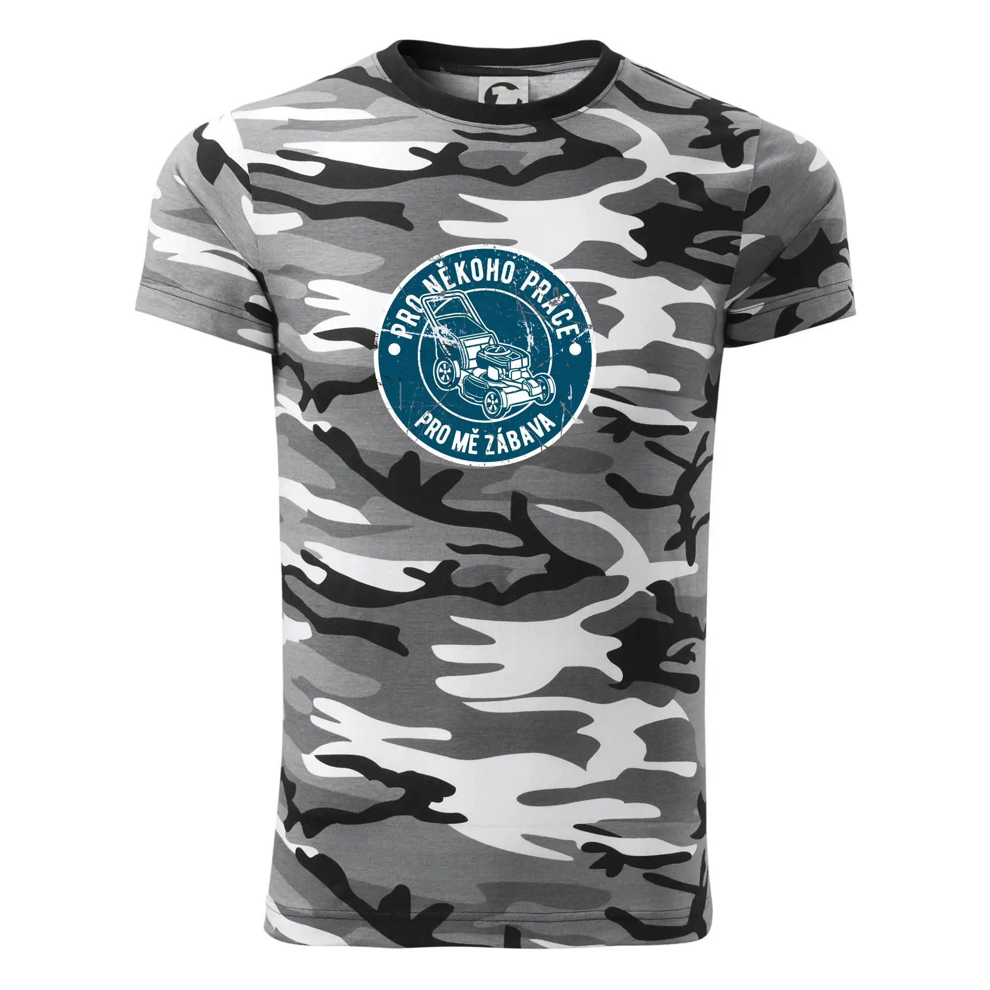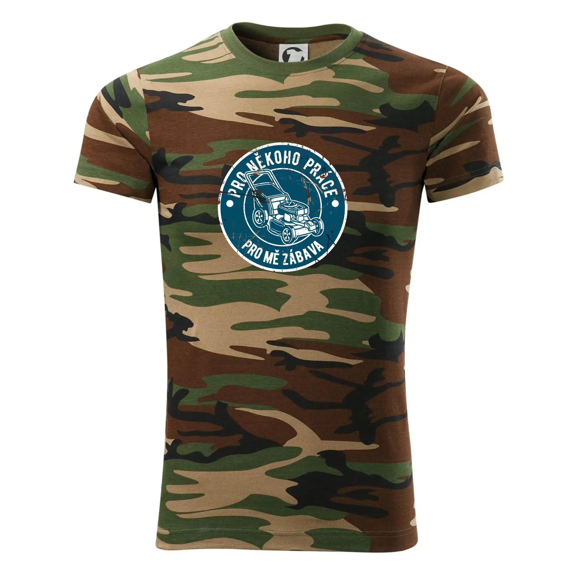 Tričko střední gramáže v barvách camouflage. Střih s bočními švy. Lem průkrčníku ze žebrového úpletu s přídavkem 5 % elastanu. Vnitřní část zadního průkrčníku začištěna páskou v barvě camouflage.