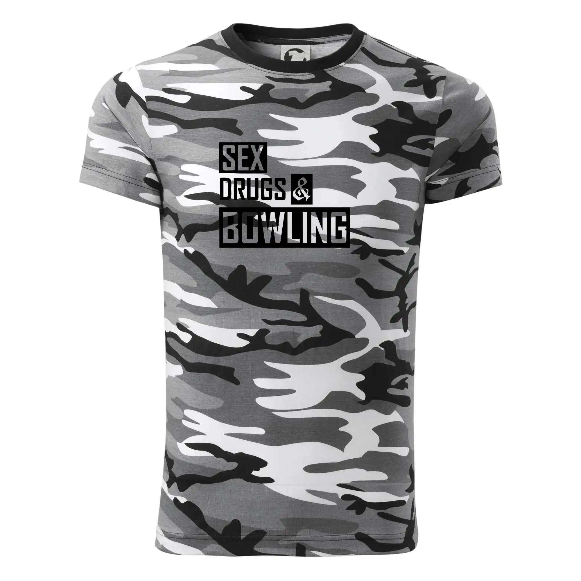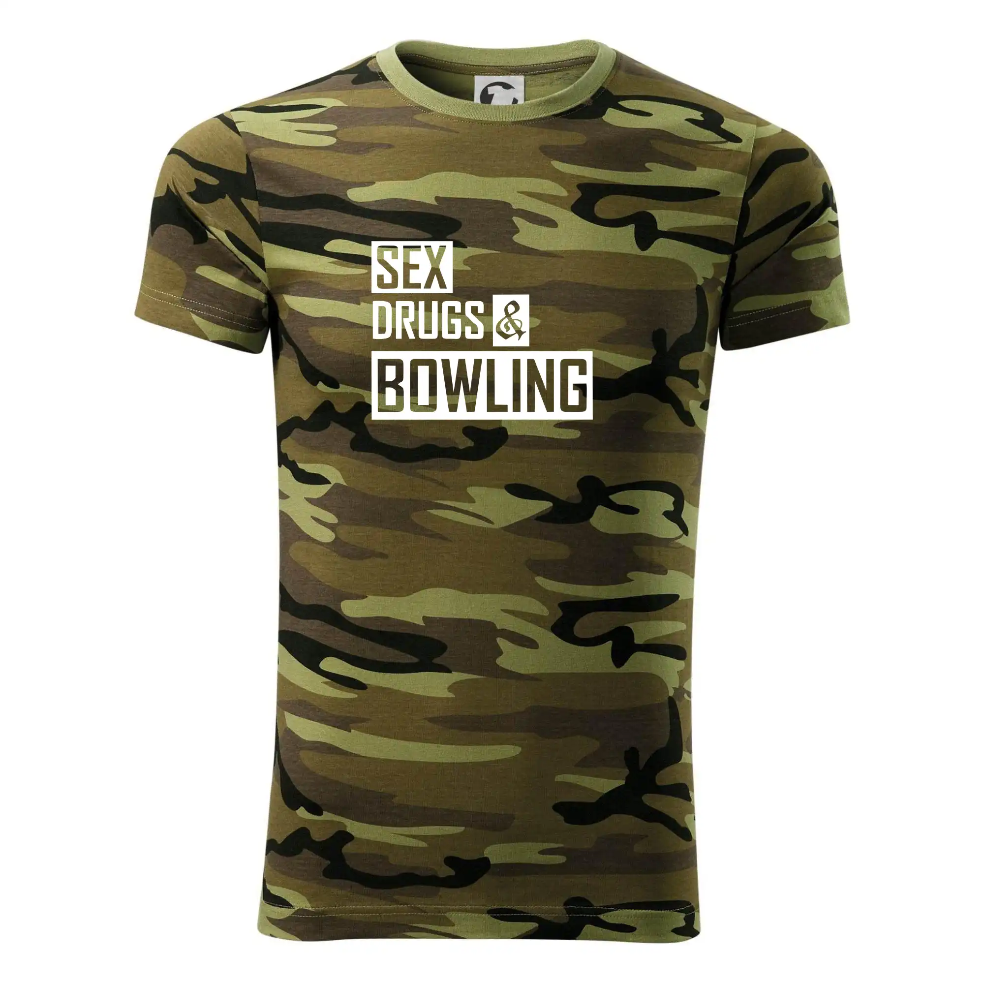 Tričko střední gramáže v barvách camouflage. Střih s bočními švy. Lem průkrčníku ze žebrového úpletu s přídavkem 5 % elastanu. Vnitřní část zadního průkrčníku začištěna páskou v barvě camouflage.