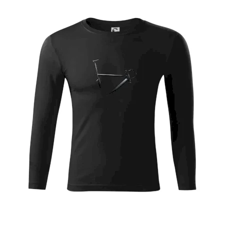 Toto tričko zobrazuje detailní siluetu moderního silničního kola ve tmavém provedení. Dominantní černá barva doplňuje jemnou kontrastní grafiku světlých částí kola a dává motivu nádech noční atmosféry. Design je ideální pro cyklisty, kteří si užívají jízdu za šera nebo milují minimalistické motivy, jež zvýrazní silu kol a sportovní eleganci.