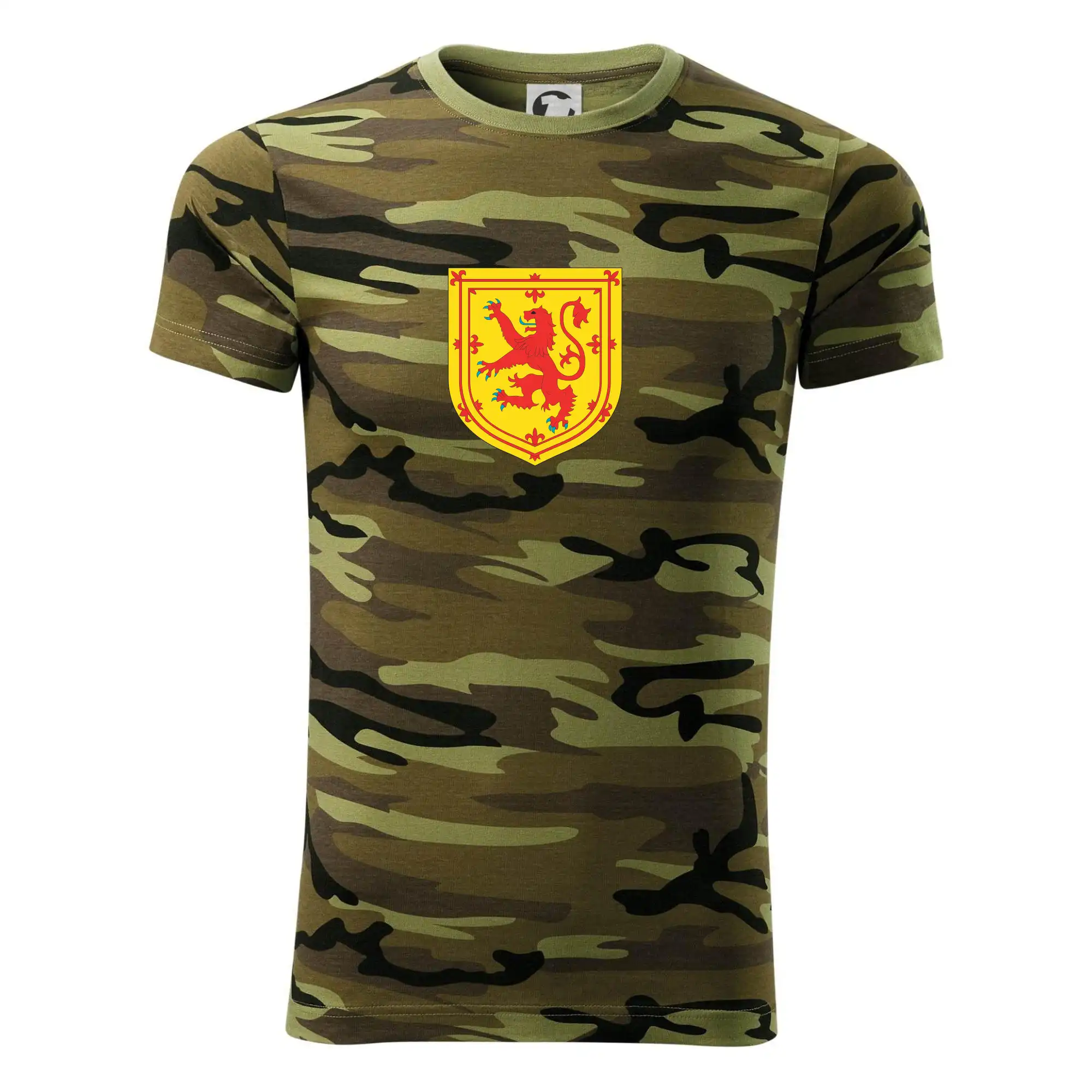 Tričko střední gramáže v barvách camouflage. Střih s bočními švy. Lem průkrčníku ze žebrového úpletu s přídavkem 5 % elastanu. Vnitřní část zadního průkrčníku začištěna páskou v barvě camouflage.