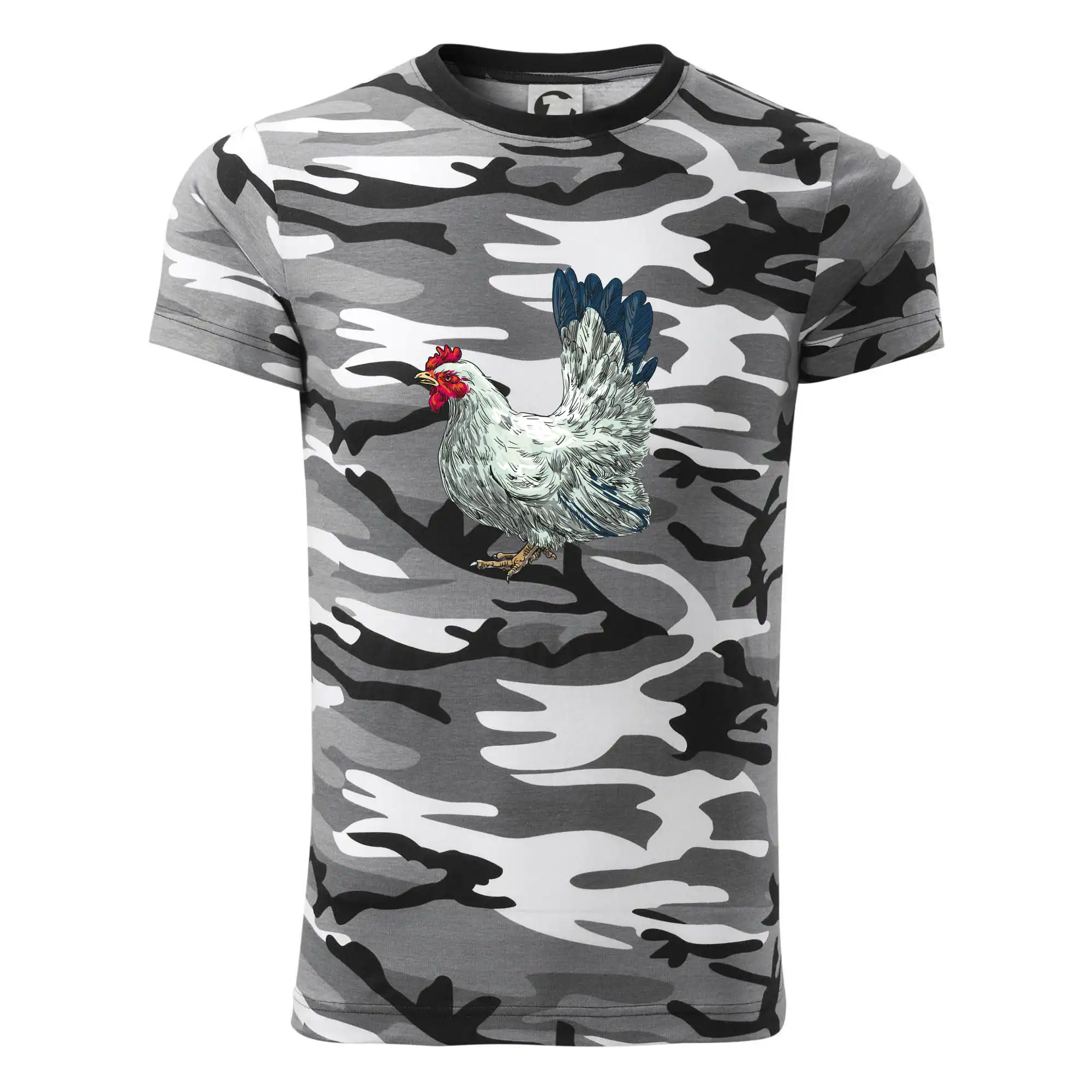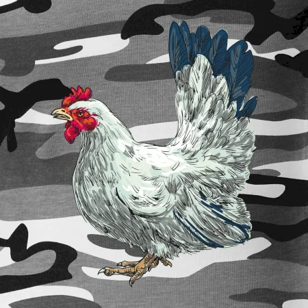 Tričko střední gramáže v barvách camouflage. Střih s bočními švy. Lem průkrčníku ze žebrového úpletu s přídavkem 5 % elastanu. Vnitřní část zadního průkrčníku začištěna páskou v barvě camouflage.