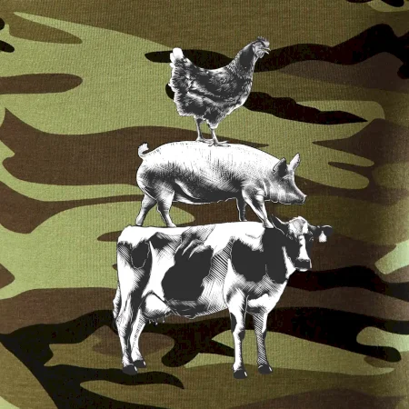 Tričko střední gramáže v barvách camouflage. Střih s bočními švy. Lem průkrčníku ze žebrového úpletu s přídavkem 5 % elastanu. Vnitřní část zadního průkrčníku začištěna páskou v barvě camouflage.